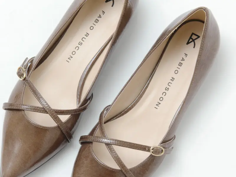 洗練された印象を与えるfabio rusconi(ファビオルスコーニ)のフラットパンプス。シャープなポインテッドトゥと、アッパーのクロスベルトデザインが足元を美しく演出します。光沢のあるレザーはほのかにシワ感があり、上品ながらも柔らかな表情をプラス。カジュアルからきれいめまで幅広いスタイルにマッチ。履きやすいフラットソールでありながら、足元に程よい存在感を添える一足です。