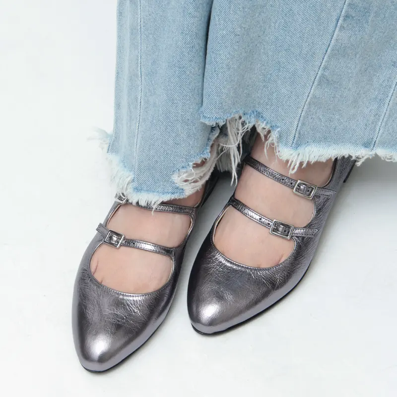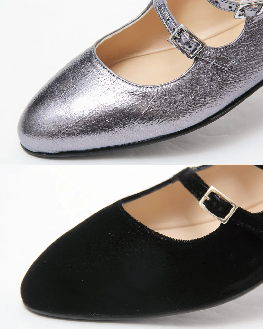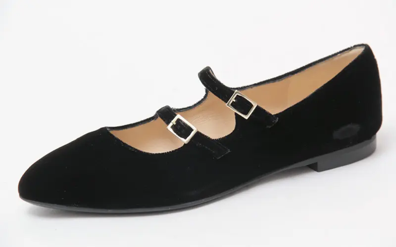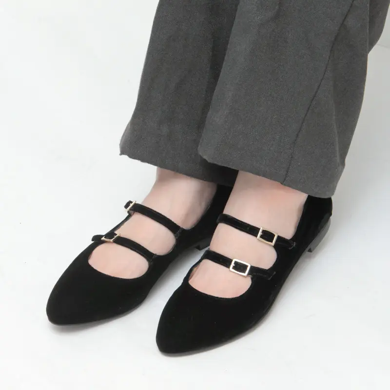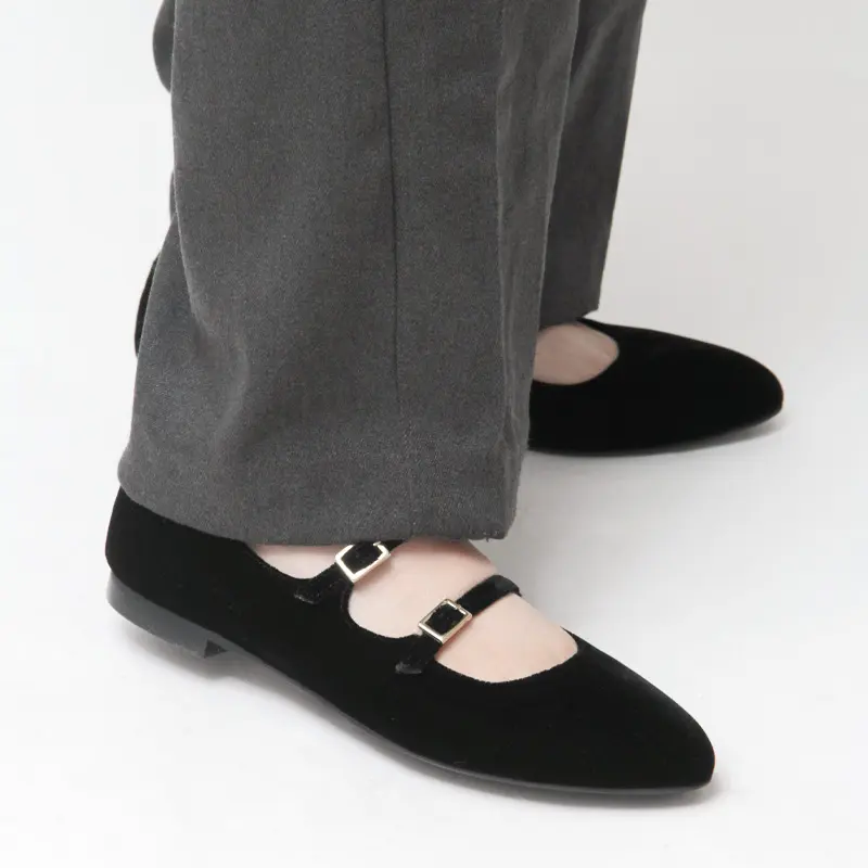 2本のベルトが立体的なデザインを作り、足をしっかりホールド。スッキリとしたアーモンドトゥのシルエットとフラットソールの安定感で、美しい足元と快適な履き心地を両立。ガンメタルの光沢やベルベットの柔らかな質感など、素材ごとの表情も楽しめ、細部までこだわりを感じられます。