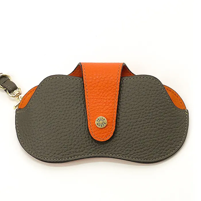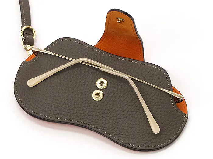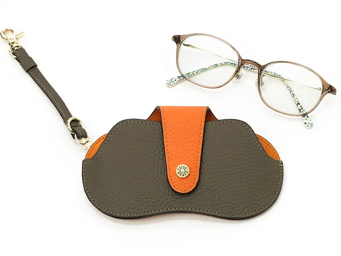 シンプルでスマートな見た目にバイカラーが映える個性的なデザイン。厚みのない薄型デザインなので眼鏡を使っているときはかさばらずスッキリ。ホックの留め位置が2つ有り眼鏡のサイズに調節できます。内側はスェード調生地になっています。