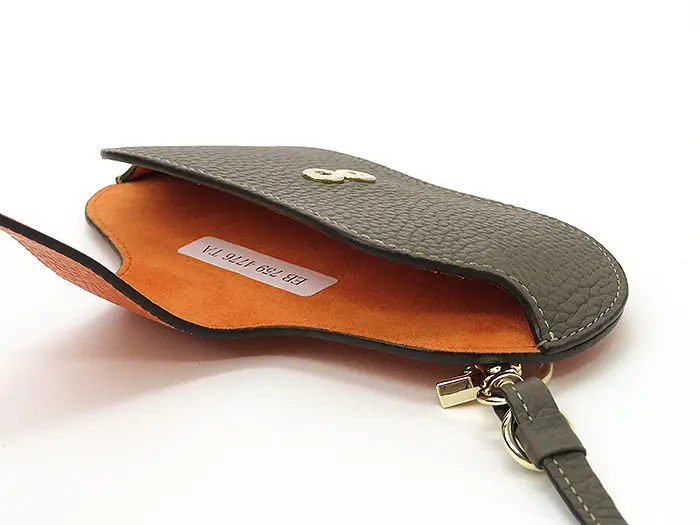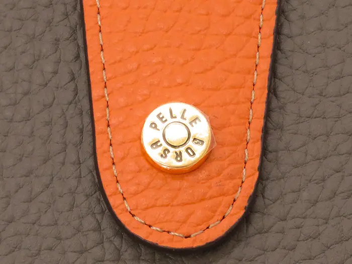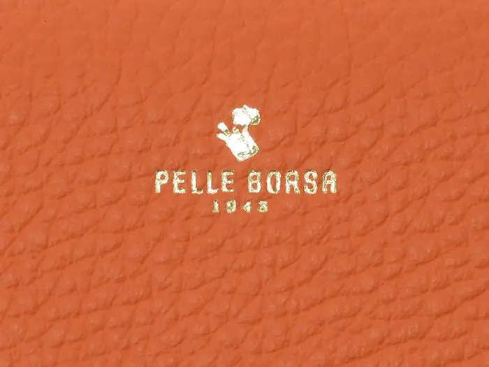レネットシリーズの牛革(型押しシュリンク)を使用。コンビネーションなめしを行っているので、絶妙にソフトでありながらきゅっと締まったコシがある風合いです。発色が美しく、ナチュラルなシュリンクの表情が素敵。シボの効いたシュリンクレザーは傷が付きにくいのが特徴です。背面にはゴールドの箔押しプリント“PELLE BORSA”が施されています。