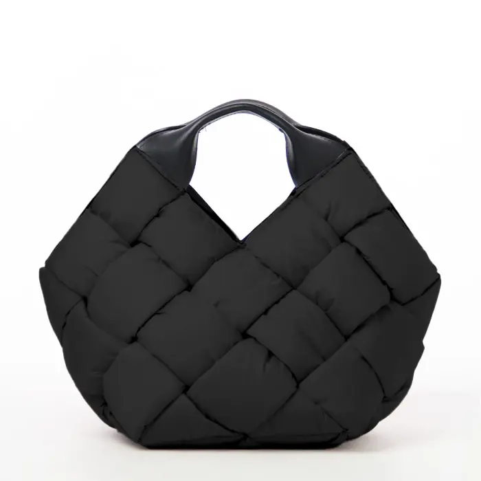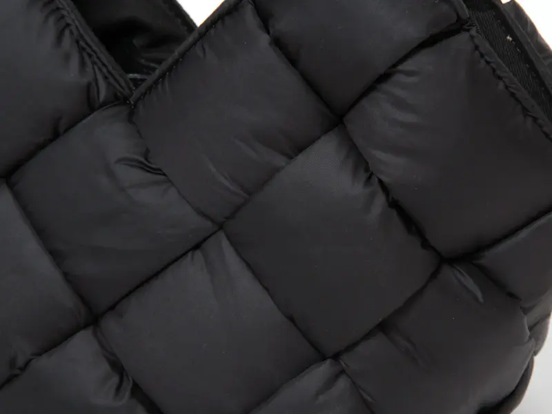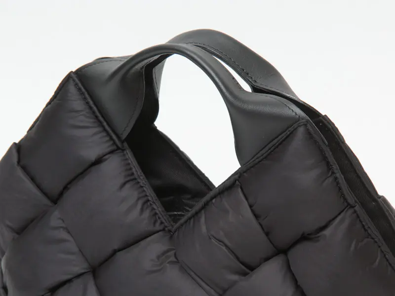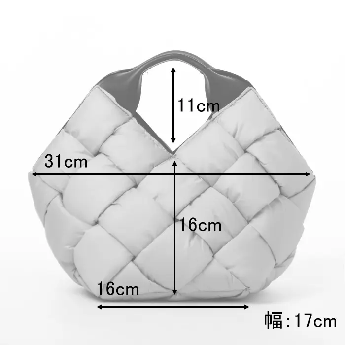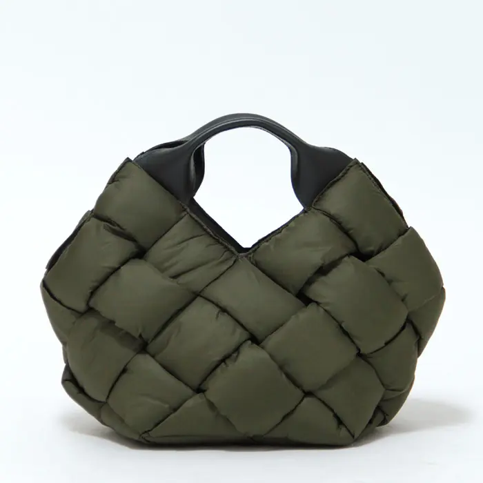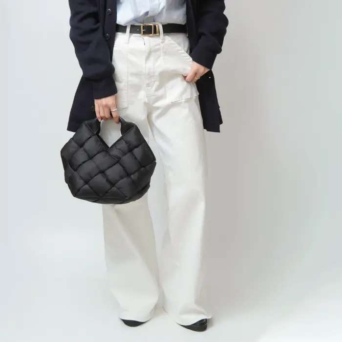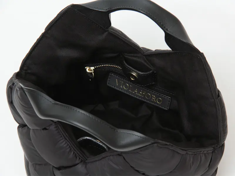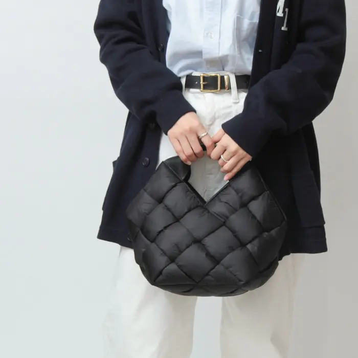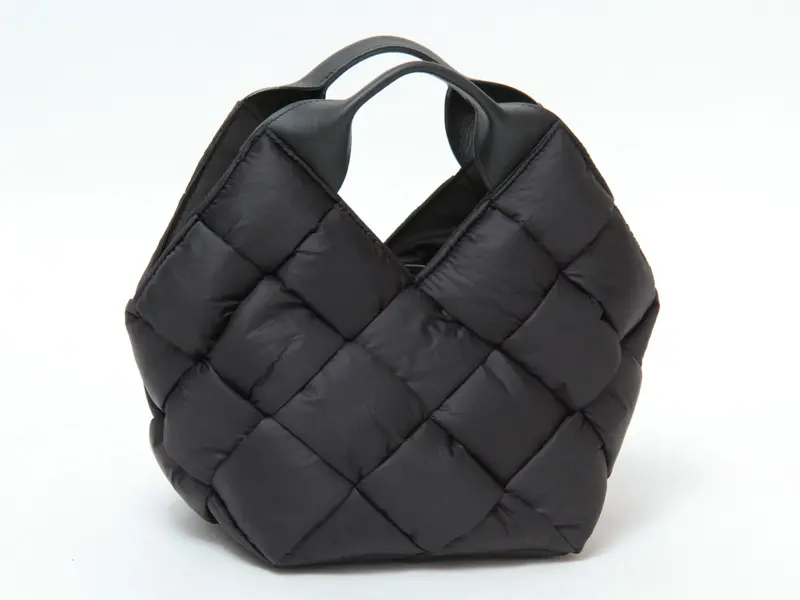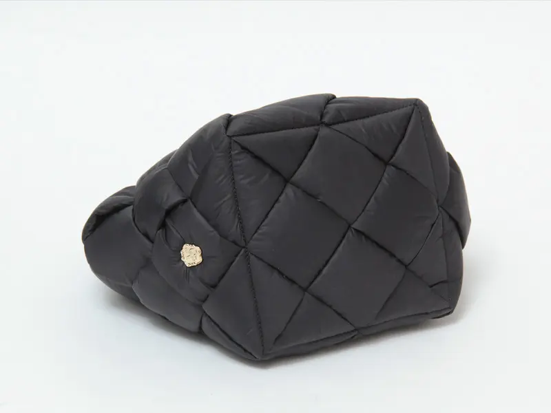 中綿入りの太めのナイロンを編んだ斬新なデザインでありながらコーデに馴染み、さり気なく存在感を発揮。ナイロンのカジュアル素材にレザーハンドルで、ヴィオラドーロらしい上品な仕上がりに。軽やかな持ち心地も嬉しいポイント。