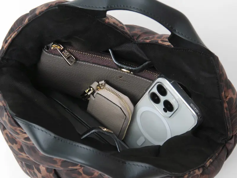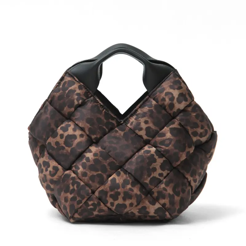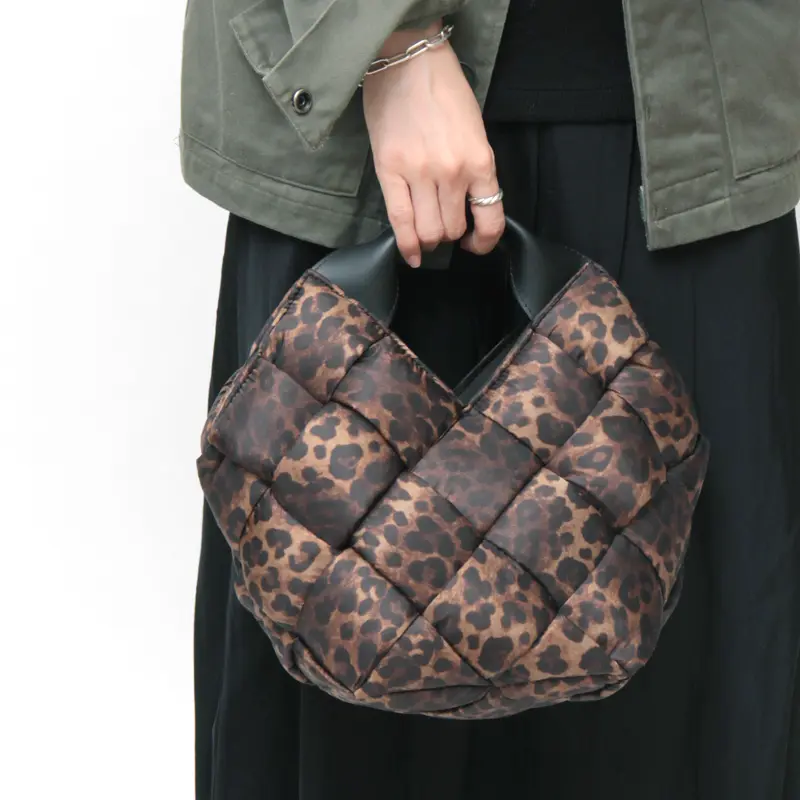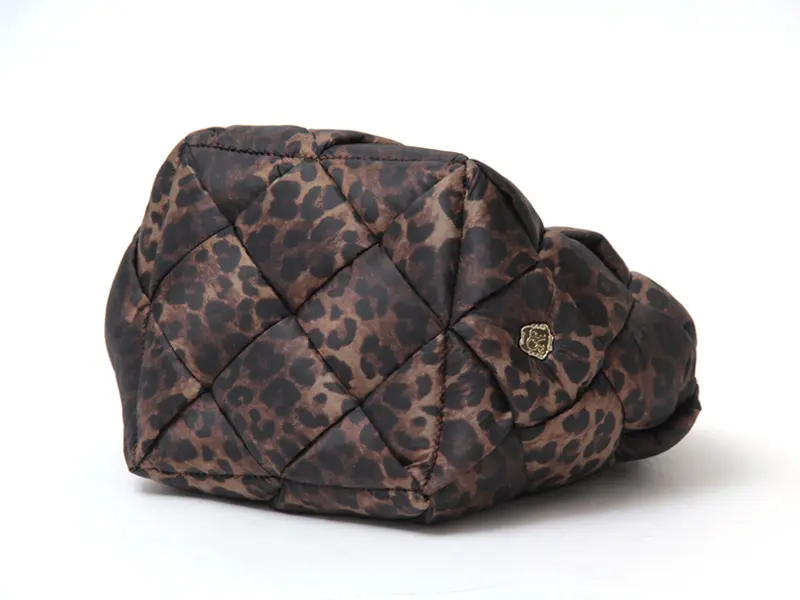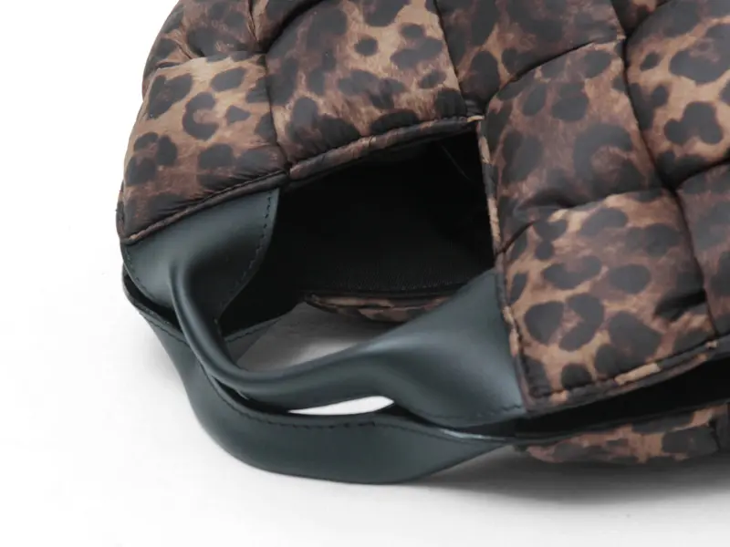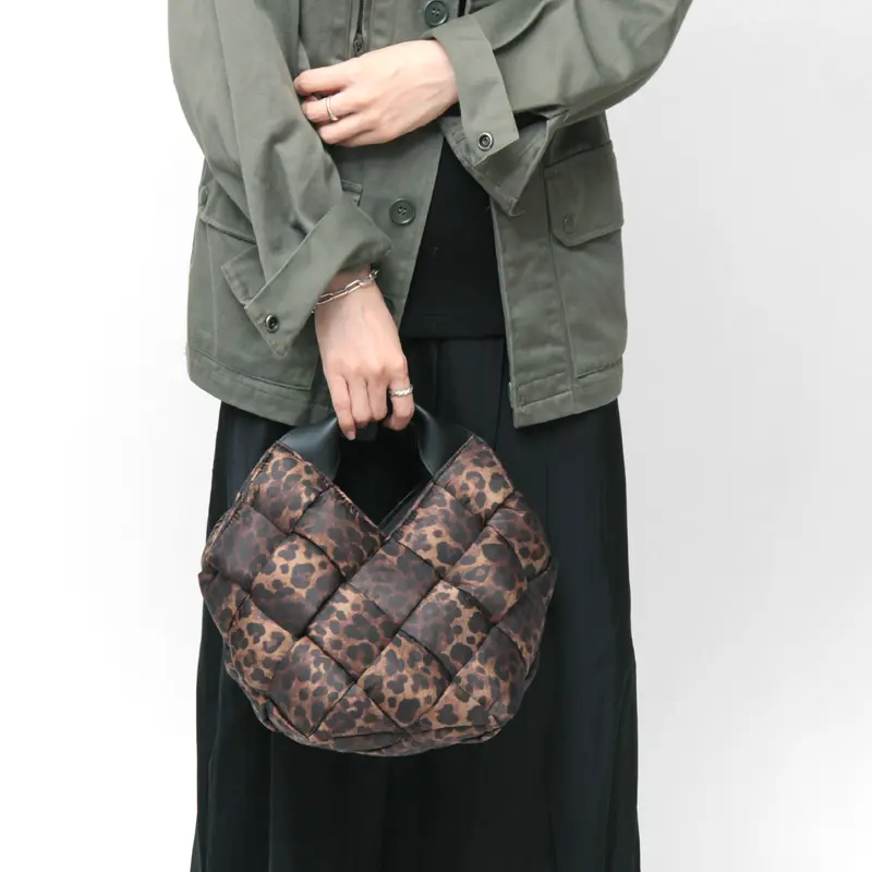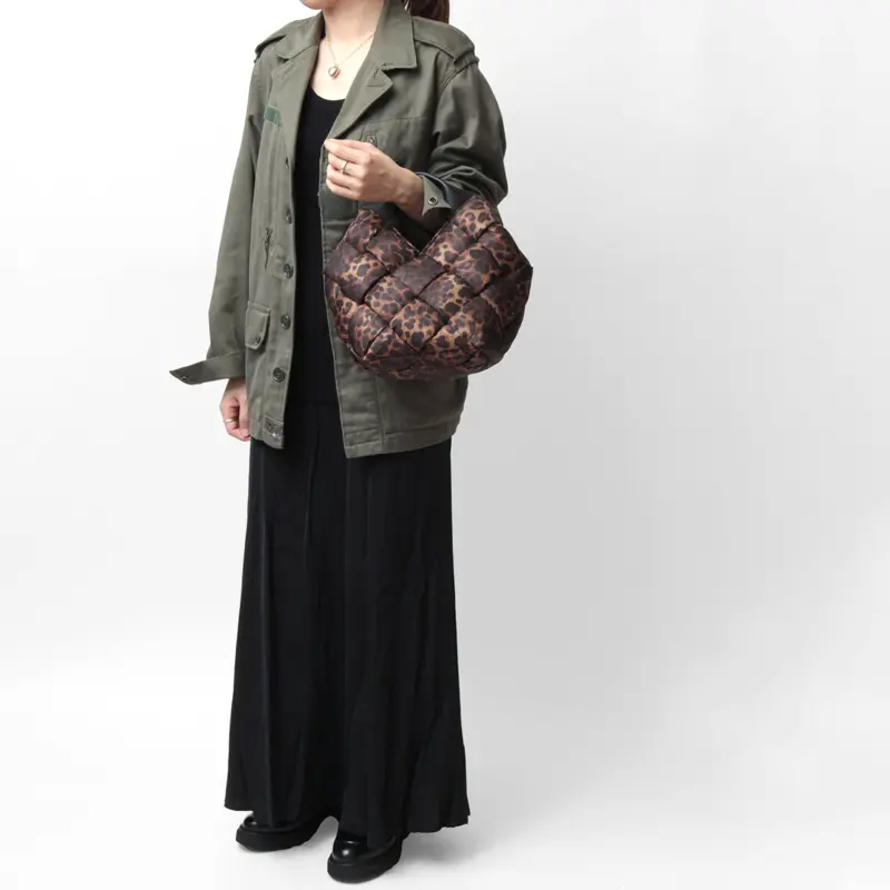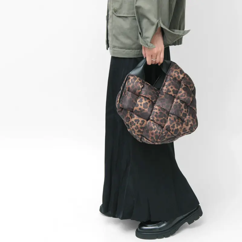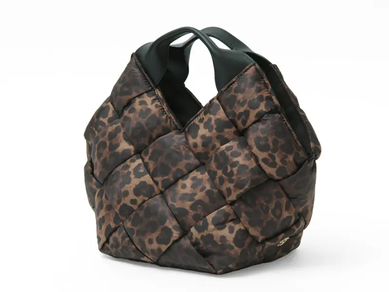 中綿入りの太めのナイロンを編んだ斬新なデザインでありながらコーデに馴染み、さり気なく存在感を発揮。レオパード柄ナイロンのカジュアル素材にレザーハンドルで、ヴィオラドーロらしい上品な仕上がりに。軽やかな持ち心地も嬉しいポイント。