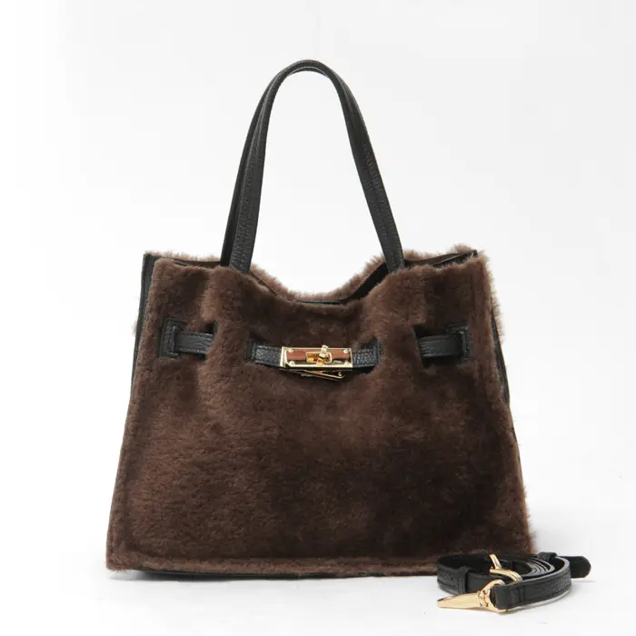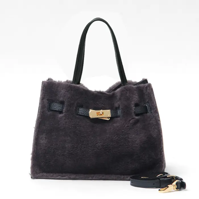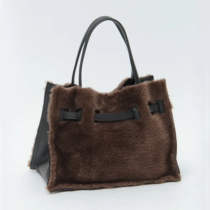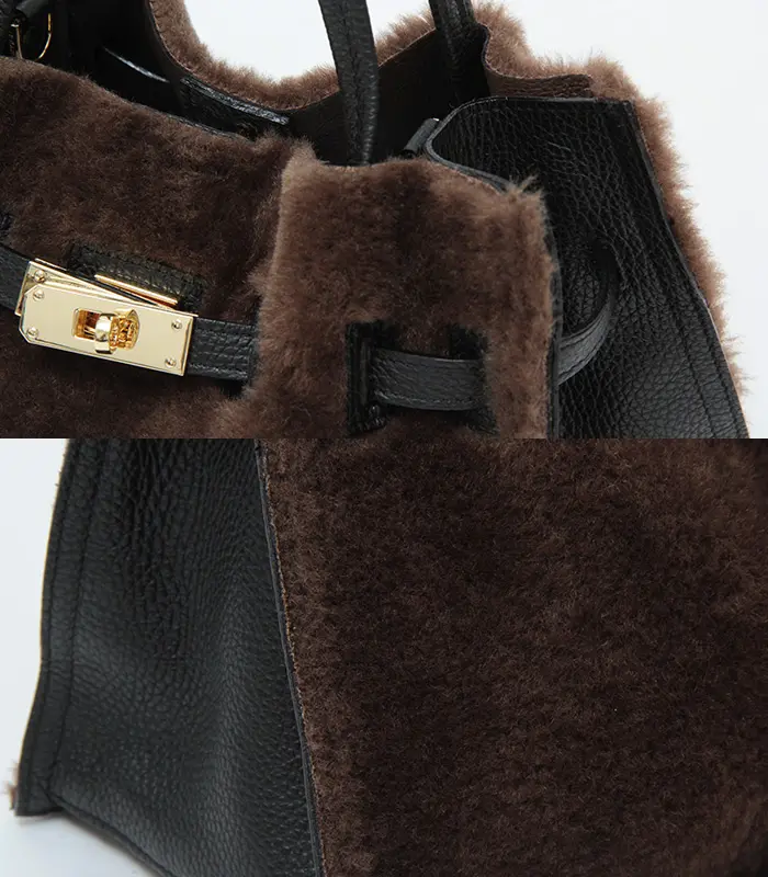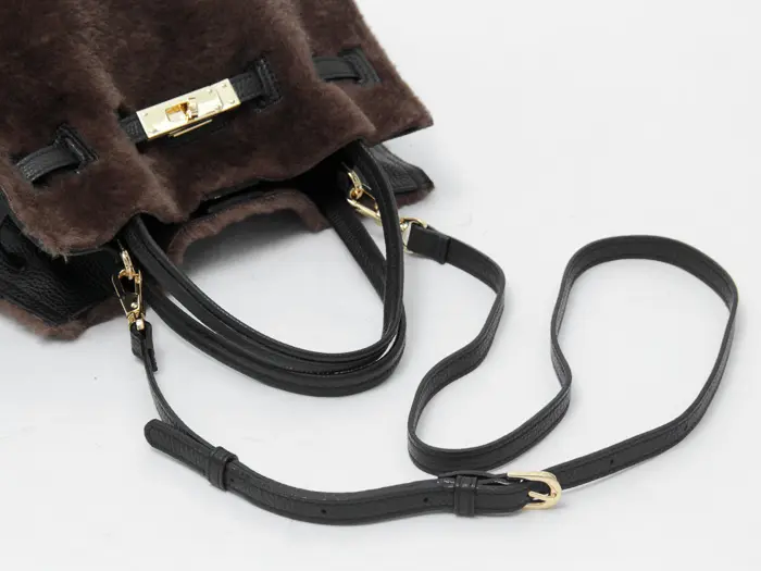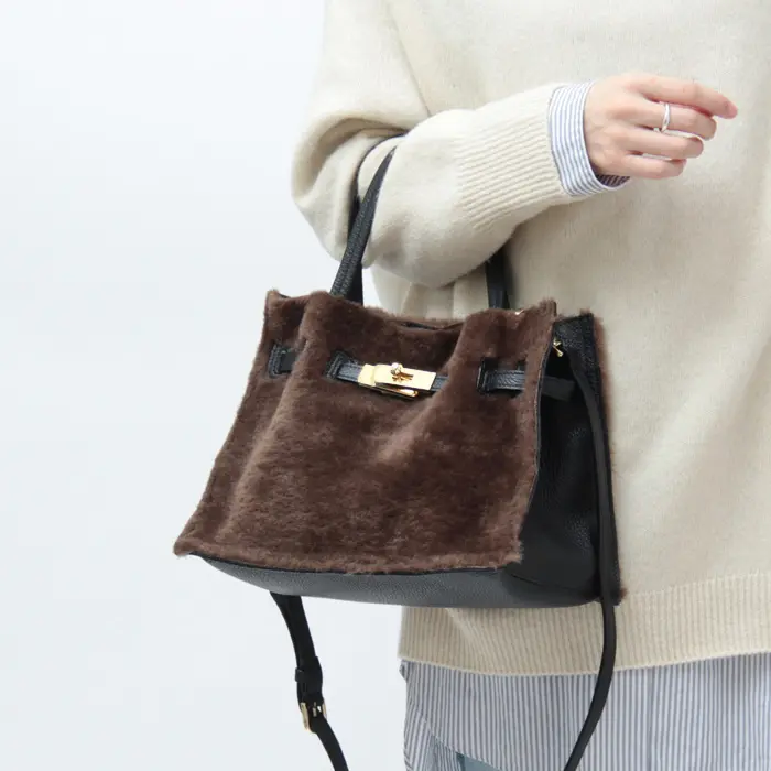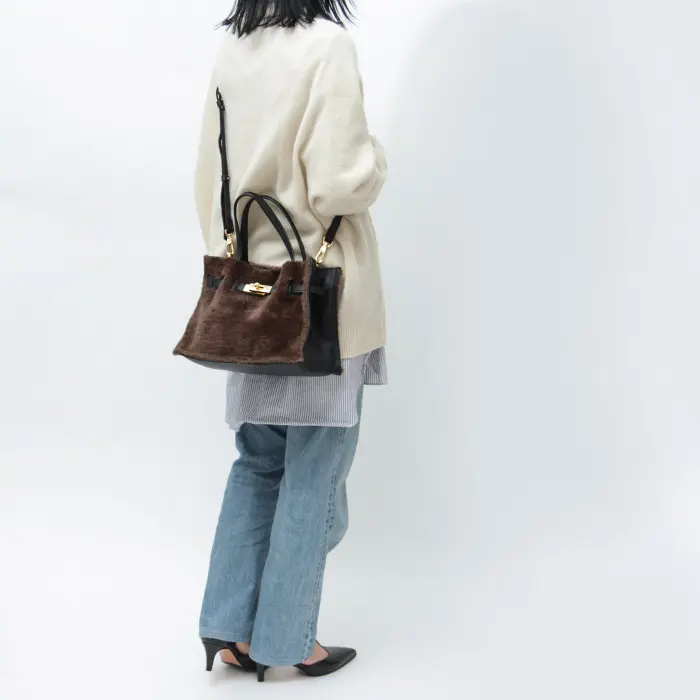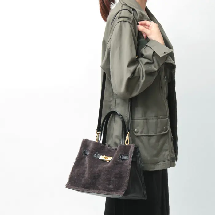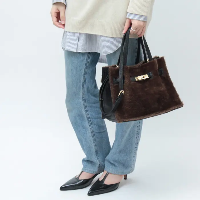 カジュアルな雰囲気が魅力のムートンタイプのエコファー。温かみのある素材がシーズンムードを盛り上げ、きれいめにもカジュアルにも合わせやすいです。上部を切りっぱなしにすることで、こなれた雰囲気を演出。レザーやゴールド金具を組み合わせることで、大人の女性にぴったりのバッグに仕上がっています。
