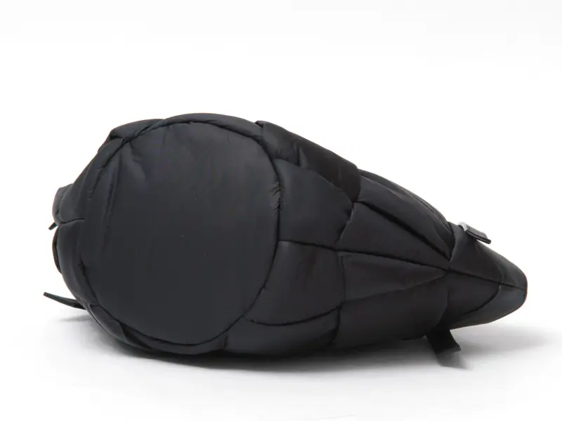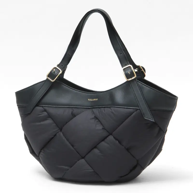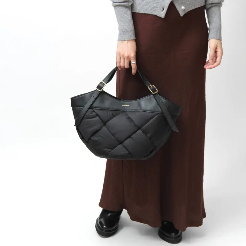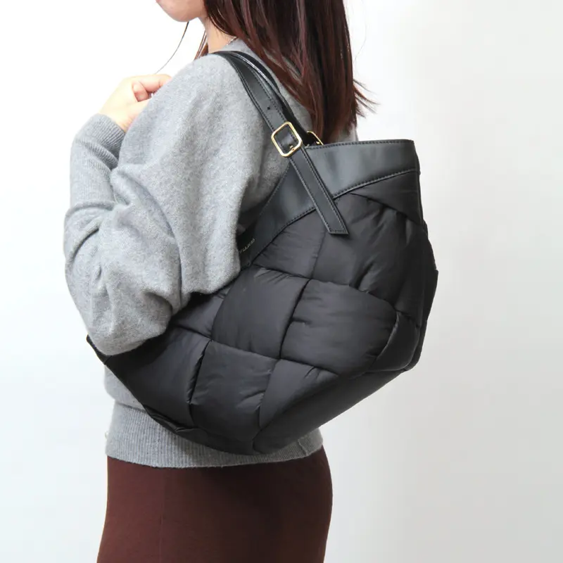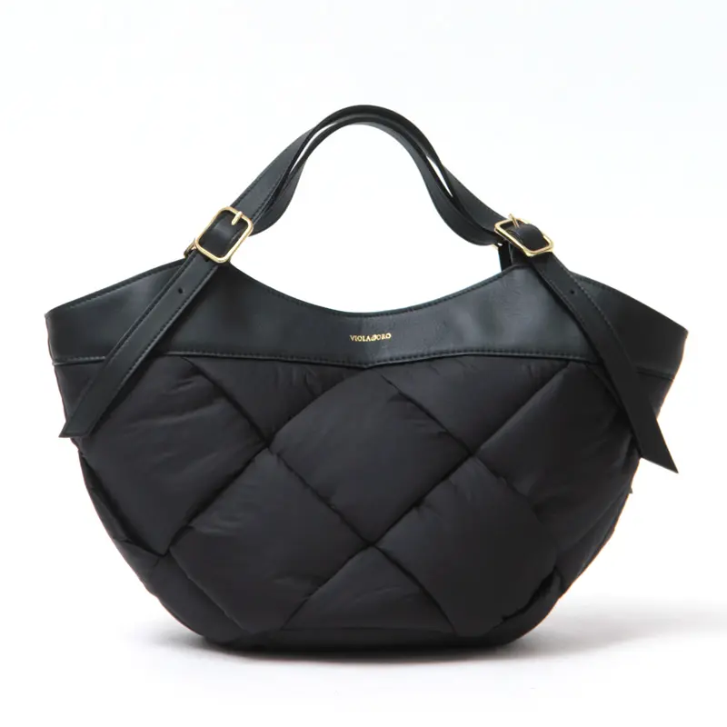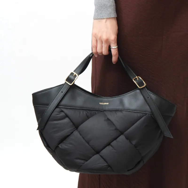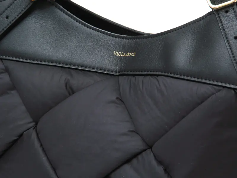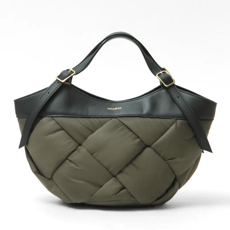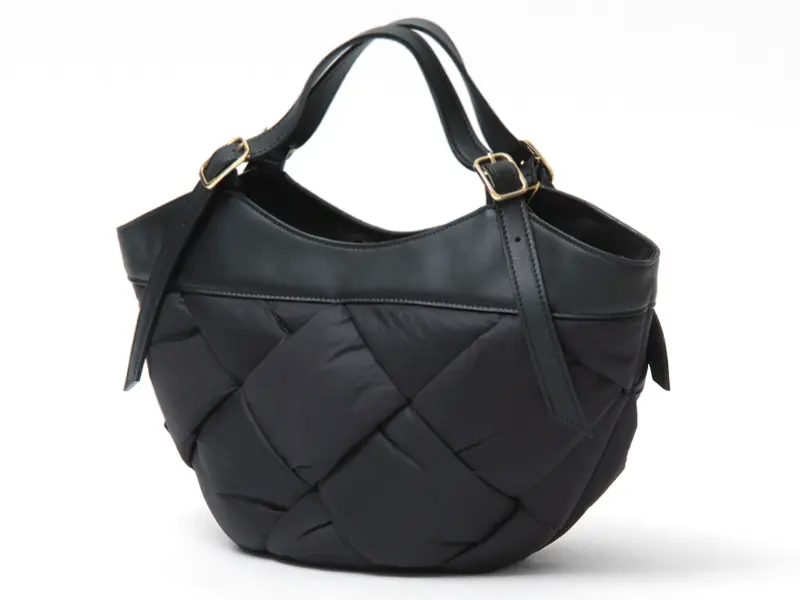 中綿入りの太めのナイロンを編んだ斬新なデザインでありながらコーデに馴染み、さり気なく存在感を発揮。ナイロンのカジュアル素材にイタリアンレザーのハンドルで、ヴィオラドーロらしい上品な仕上がりに。軽やかな持ち心地も嬉しいポイント。