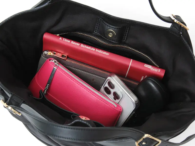 開閉はマグネット仕様。長財布やメガネケース、ポーチなどお出かけの必需品がゆったり収まる見た目以上の収納力です。内側にはポケットが備わっており、鍵やイヤホンなどの小物も整理して収納できます。普段にお出かけに使いやすいサイズ感です。