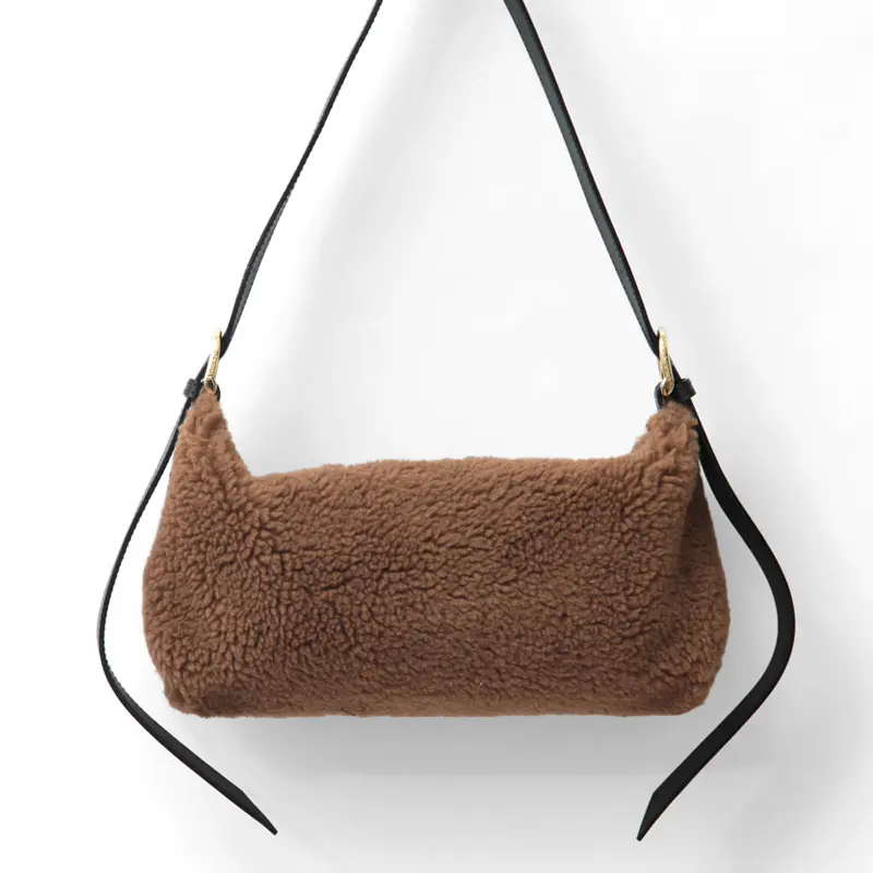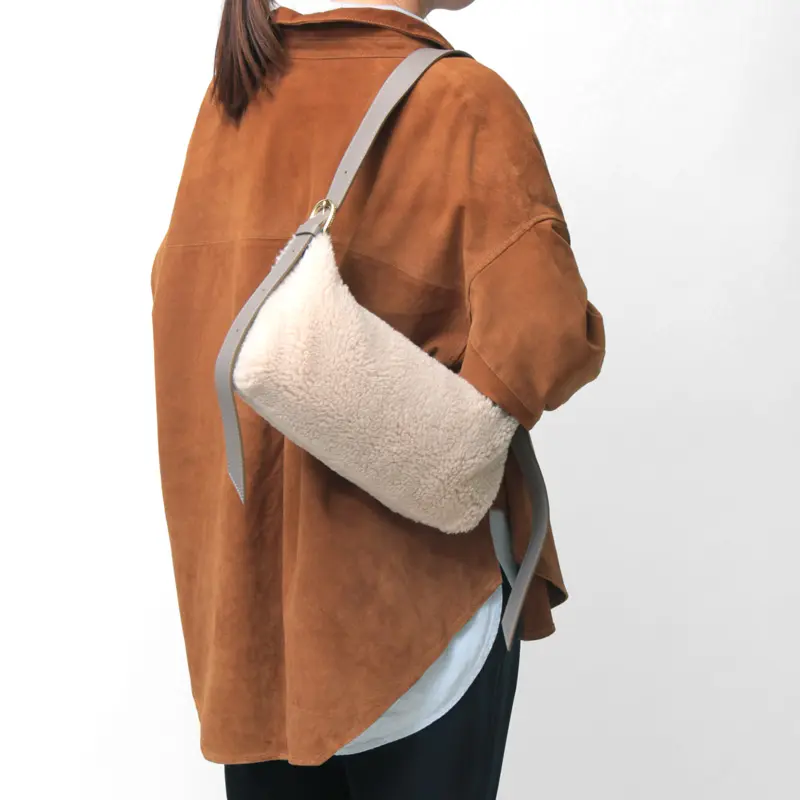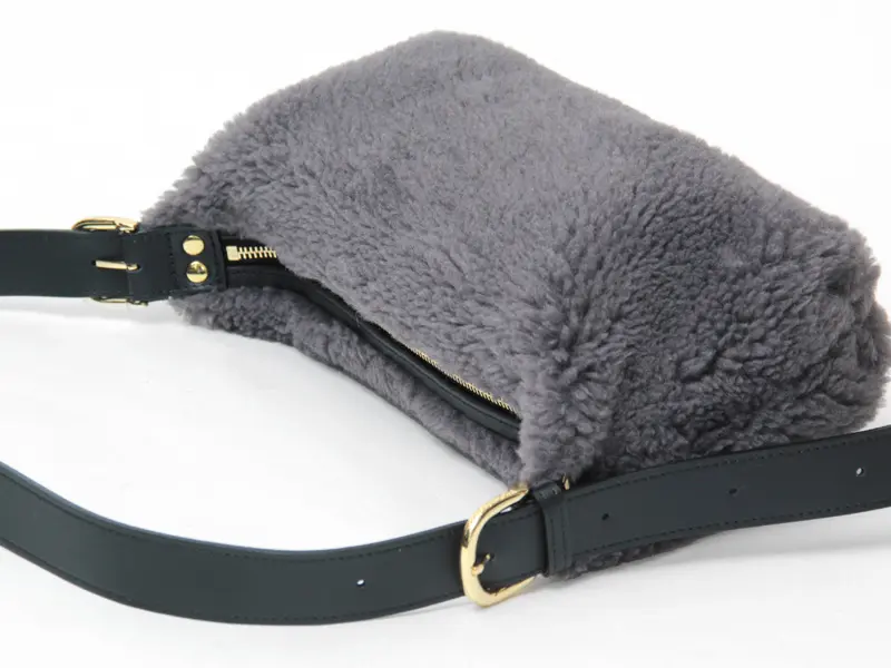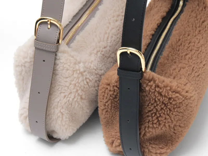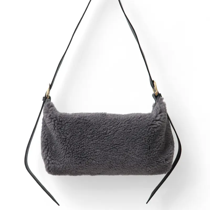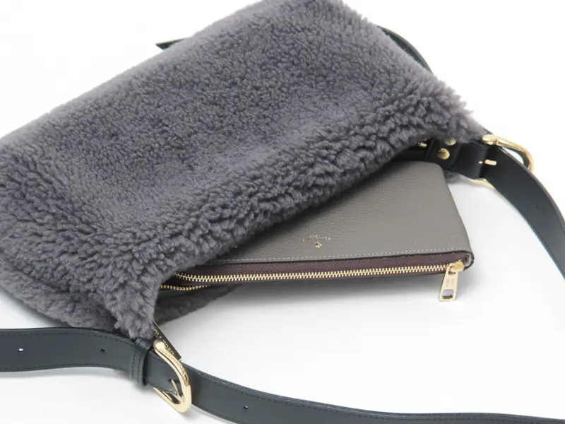 もこもこのエコムートン素材をメインに、レザーのハンドルやゴールド金具で上品さをプラスしたデザイン。太めで長さのあるショルダーは左右共に5段階で長さ調節ができ、斜め掛けでクロスボディバッグとしてだけでなく、肩に掛けたり、ゆったり手持ちでお持ちいただけます。