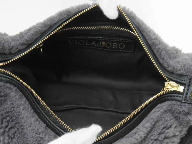 カジュアルな雰囲気が魅力のムートンタイプのエコファー。温かみのある素材がシーズンムードを盛り上げ、きれいめにもカジュアルにも合わせやすいです。レザーやゴールドの金具を組み合わせることで、大人の女性にぴったりのバッグに仕上がっています。また"VIOLAd'ORO"のVIOLA=紫、ORO=金を意味することから、ブランドロゴが刻まれたゴールドの金具が使われています。