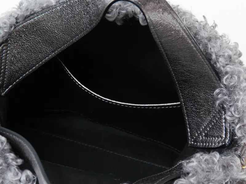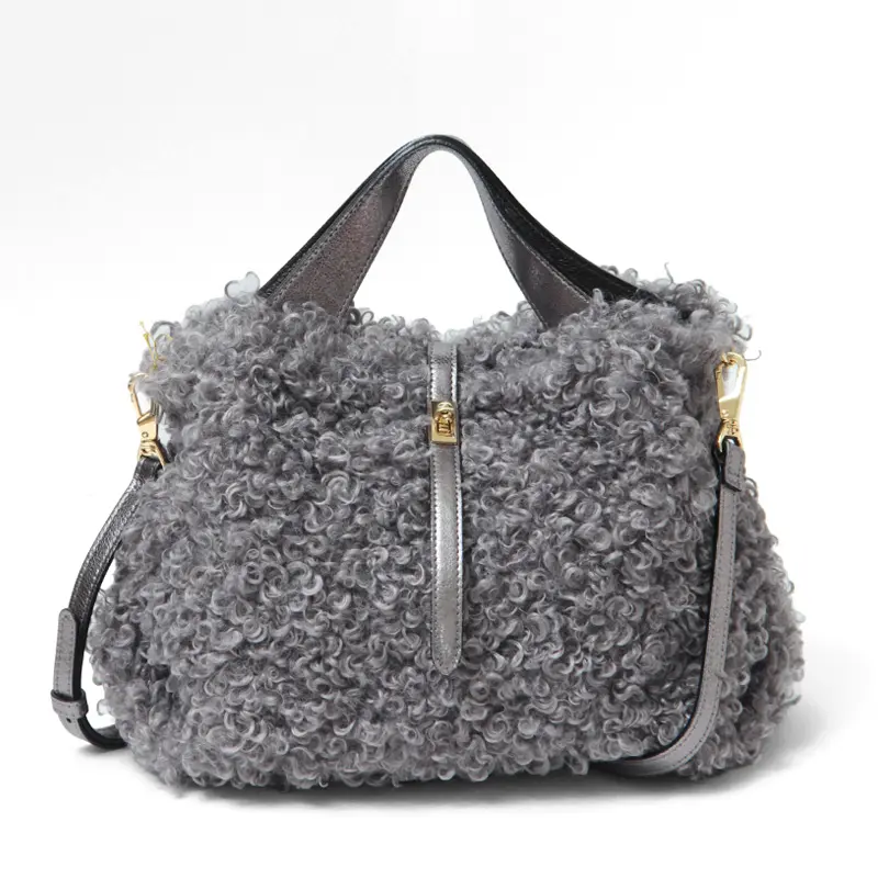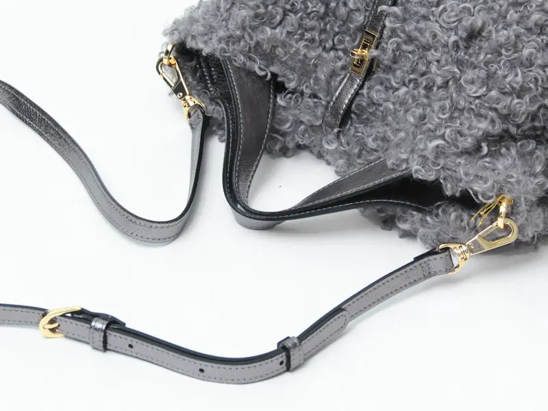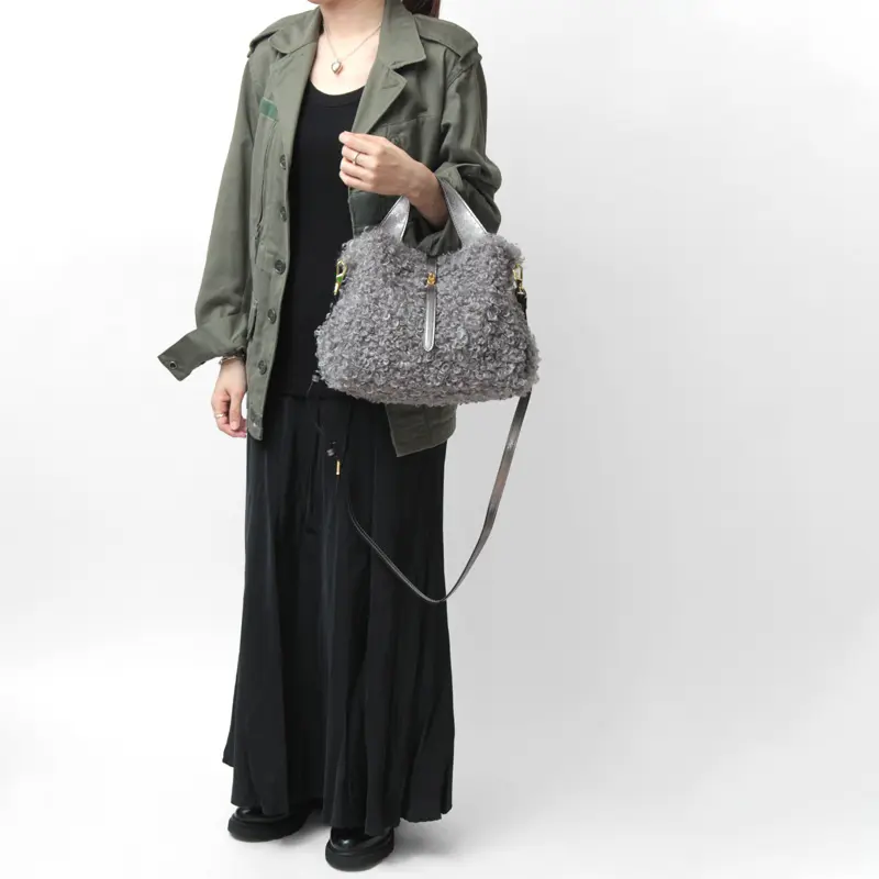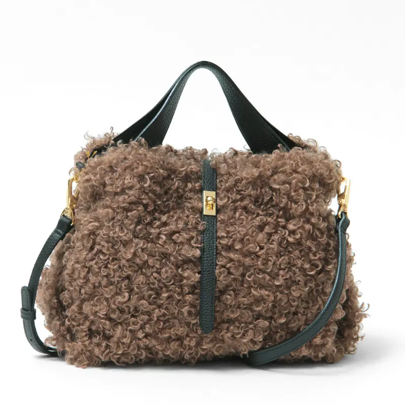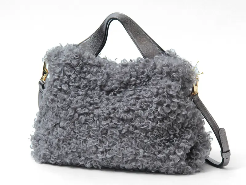クルクルとカールした愛らしいカルガンラム風エコファーを使用した"VIOLAd'ORO ヴィオラドーロ"のファーバッグ。温かみのある素材がコーディネートに季節感をプラスしてくれます。ポイントにレザーやゴールドパーツを使った上品なデザインが大人の女性にぴったりです。必需品が収まる使い勝手の良いサイズで、斜め掛けもできる2way仕様で幅広いシーンで活躍します。