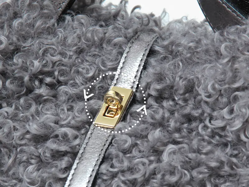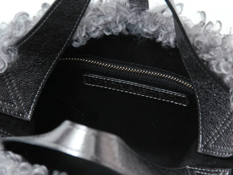 クルクルとしたカールが特徴のカルガンラム風エコファー。ふんわり柔らかな手触りで、高級感と可愛らしさを兼ね備え、スタイリングに華やぎをプラスしてくれる素材です。また"VIOLAd'ORO"のVIOLA=紫、ORO=金を意味することから、ブランドロゴが刻まれたゴールドの金具が使われています。
