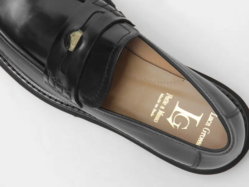 職人技とファッションを兼ね備えた“LUCA GROSSI ルカ グロッシ”のコインローファー。艶やかなブラックレザーを使用し、上品な光沢が足元を引き締めます。サドルの切れ込みにゴールドの硬貨をさりげなく配し、シンプルながら存在感のあるアクセントに。厚みのあるラバーソールは軽量かつクッション性に優れ、歩きやすさと安定感を兼備。オンオフ問わず活躍し、シーズンレスで愛用いただけるベーシックシューズです。