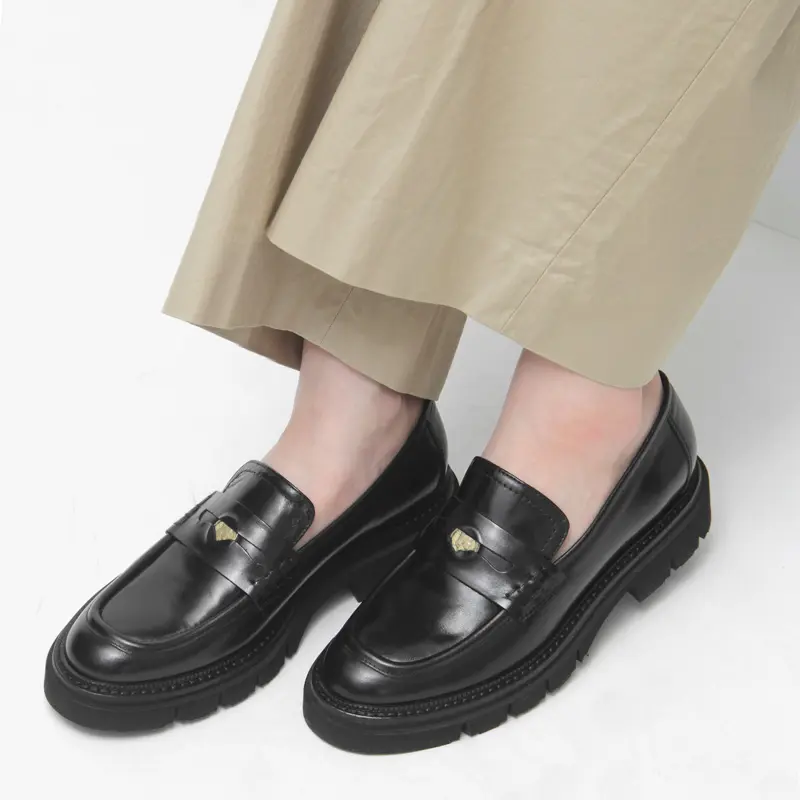 シーンを選ばず活躍する、本革ローファー。オフィスではセンタープレスのスラックスやセットアップに合わせて、端正なムードを纏いながら程よい抜け感を演出。休日にはフレアスカートやシャツワンピースと合わせ、女性らしさの中にモードなエッセンスをプラス。上品な艶のある牛革素材を用いて、きちんと感を要するオフィスコーデやオンシーンにもマッチします。
