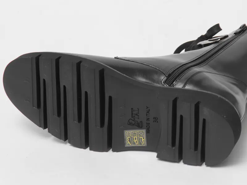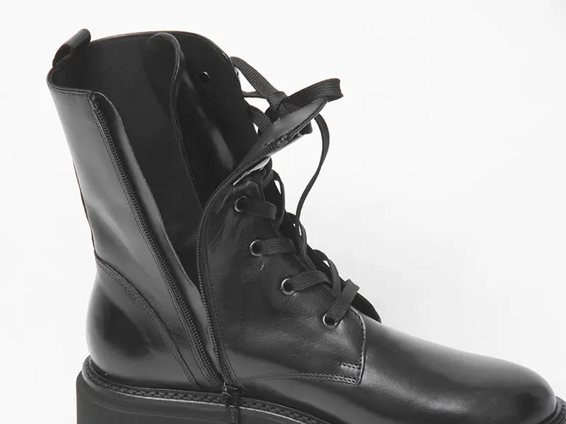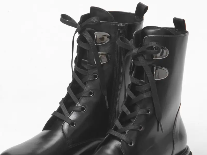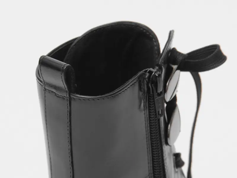足首をシェイプしたコンバットブーツは、レースアップデザインでフィット感を調節可能。さらに内側にファスナーがあるので、着脱もスムーズです。インソールにはクッション性があり、足への衝撃を和らげるため、長時間履いても疲れにくい仕様になっています。