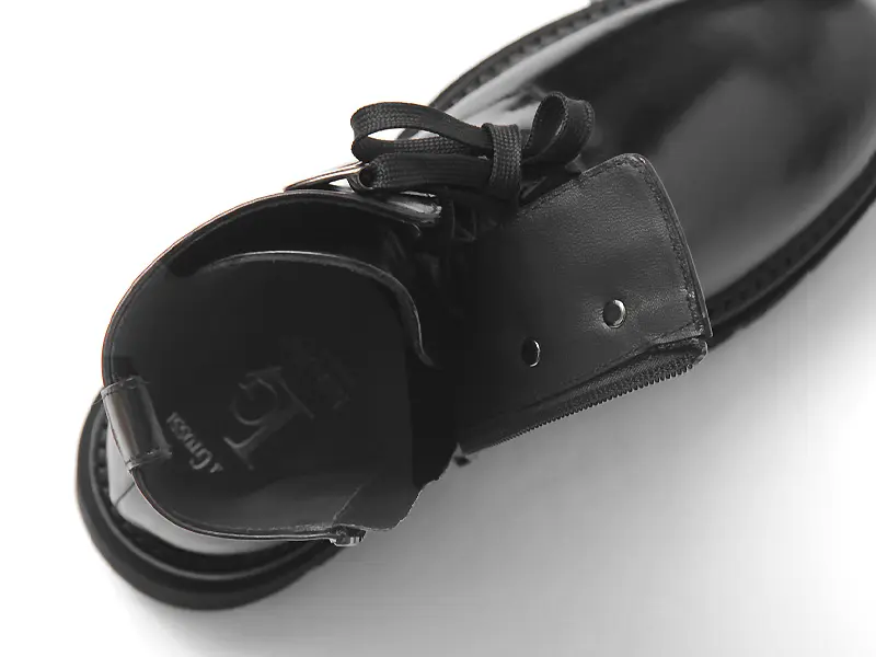 イタリアの老舗シューズブランド“LUCA GROSSI ルカ グロッシ”のレースアップブーツ。艶やかなブラックレザーのシャープなフォルムに、シルバーのシューレースフックがアクセントとなり、足元に都会的なエッジを効かせます。シンプルながらも存在感を放ち、カジュアルからモードまで幅広いスタイリングにマッチする一足です。