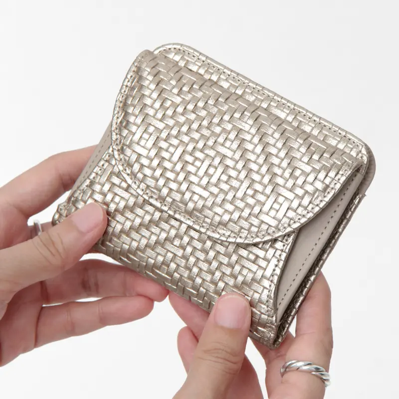 日本のバッグ・革小物ブランドARUKAN(アルカン)。立体的な型押し加工で編み込み模様を表現したPANERO(パネロ)シリーズの折り財布は、光の角度によって豊かな陰影が生まれるのが魅力です。コンパクトなサイズ感ながら、紙幣・小銭・カードをスマートに収納できる優れた実用性を備え、デイリーから特別なシーンまで幅広く活躍。バッグの中で輝くアクセサリーのような存在感を放つ一品です。