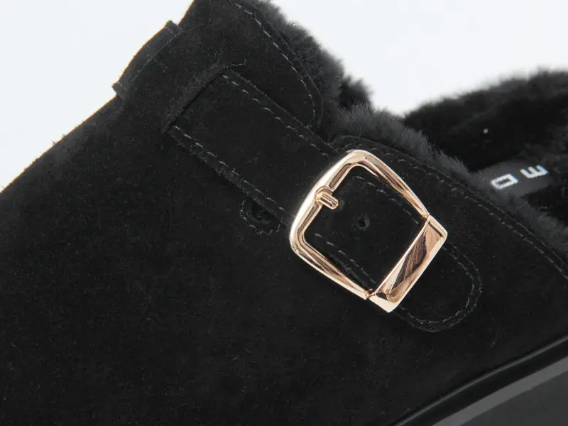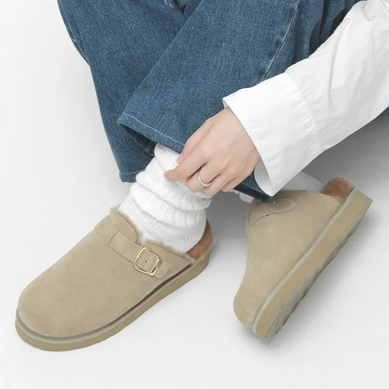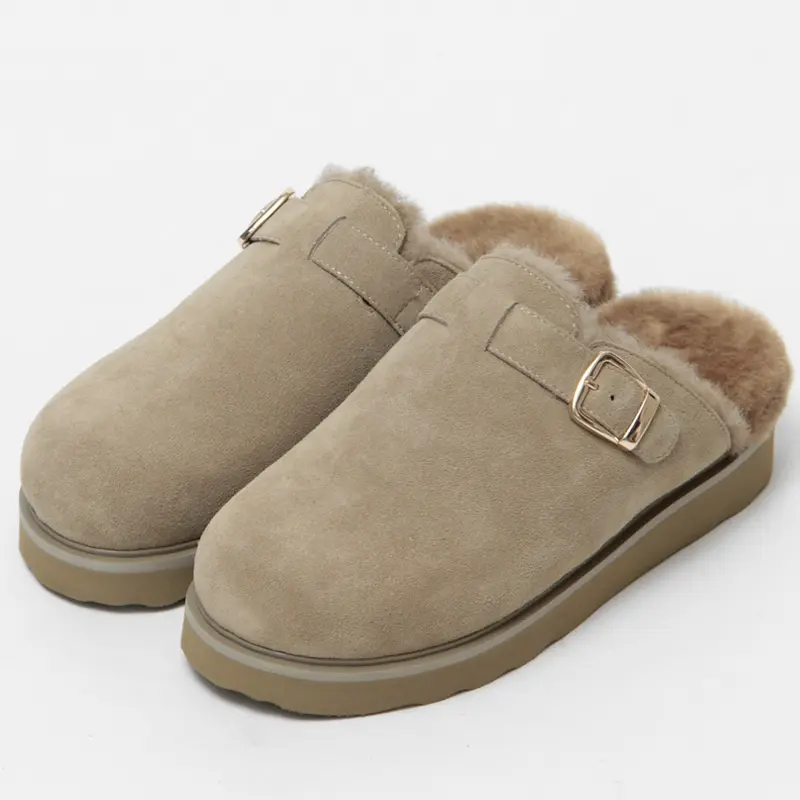 上品なスエード素材と、ゴールドのバックルがリュクスなアクセントを添えるサボサンダル。アッパーには牛革を使用しており、履くほどに足に馴染みます。つま先を覆うデザインと、内側のファーが、温かく優しい印象を与えます。