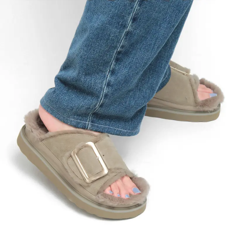 暑さが残る初秋には素足で履いて季節を先取り。涼しくなってきたら、お気に入りの靴下を合わせて、暖かさとファッション性を両立させましょう。吸湿性に優れたムートン素材なら、汗をかいてもべたつかず、夏場でも快適。シーズンレスに使えるので、コーディネートの幅がぐっと広がります。シンプルな装いにプラスするだけで、トレンド感のあるスタイルが完成します。