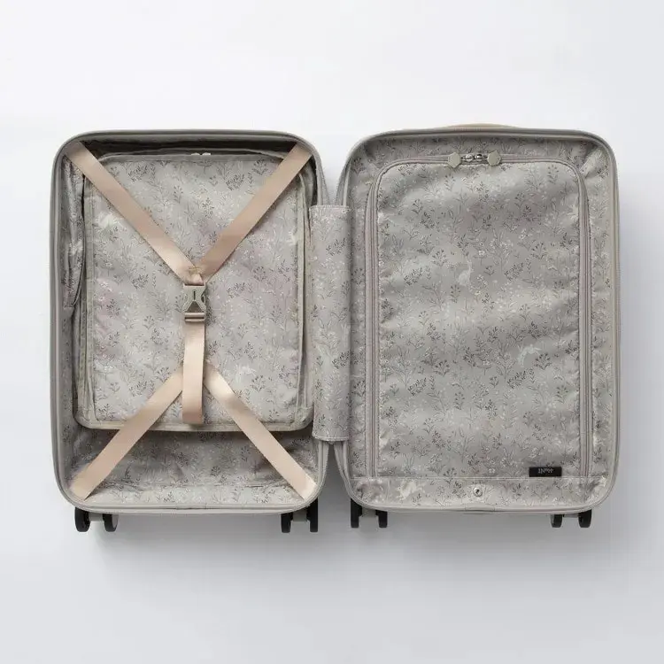両面収納が可能な2部屋仕様。荷物を分けて整理できるので、お土産や家族とのシェアにも便利です。どんなコーディネートにも合わせやすいニュアンスカラーは、一緒に写真を撮りたくなるような優しい色合い。旅のわくわく感を後押ししながら、可愛い内装デザインとともに特別な時間を彩ります。