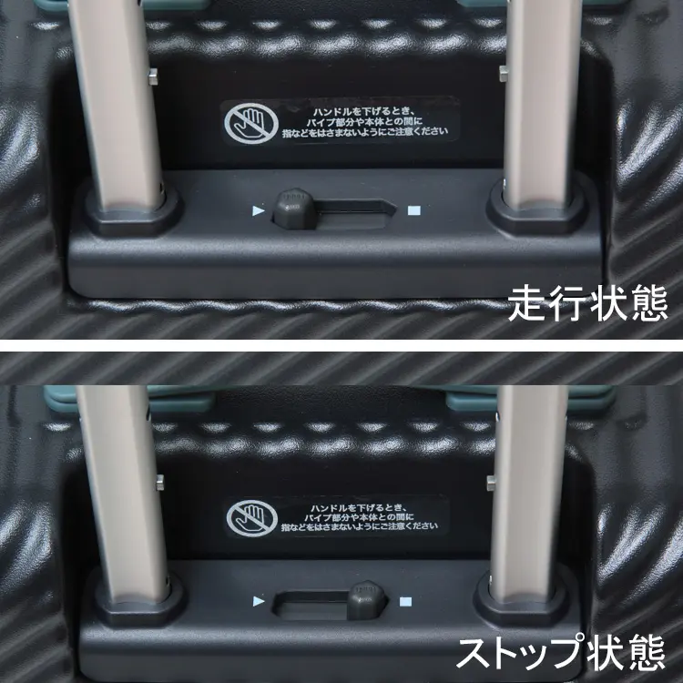 電車での移動中に便利なキャスターストッパー付き。操作も手元のワンタッチで簡単に行えます。