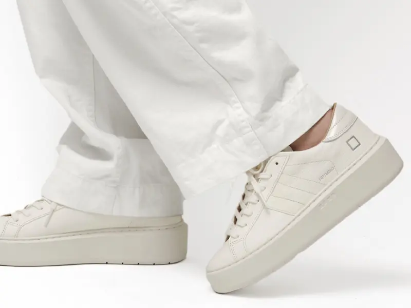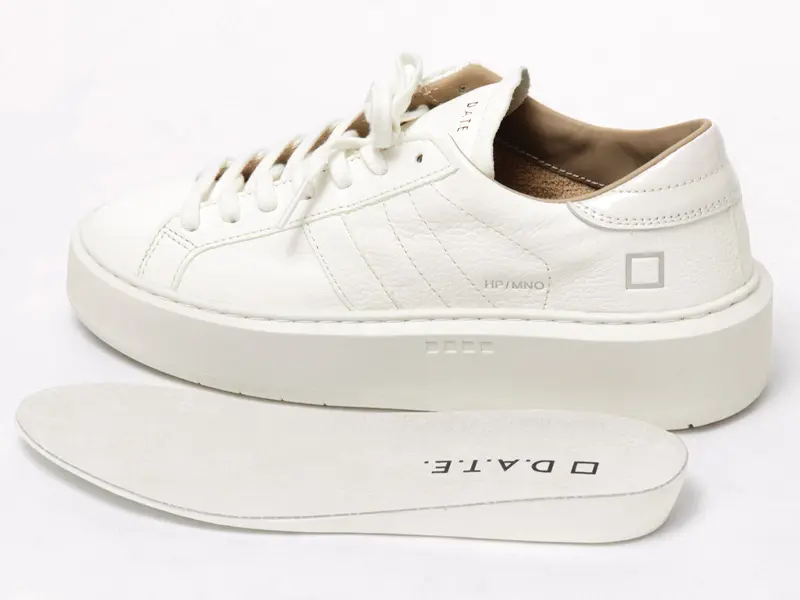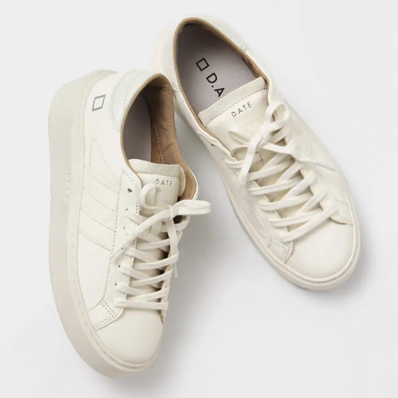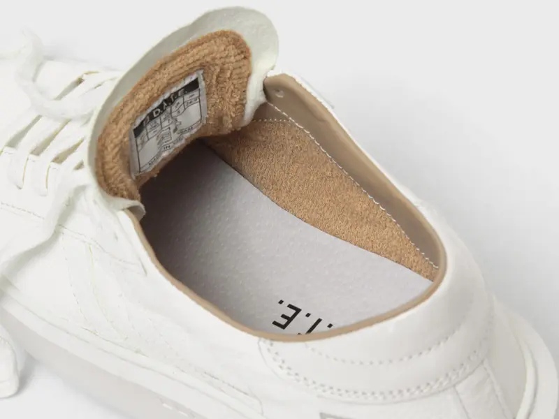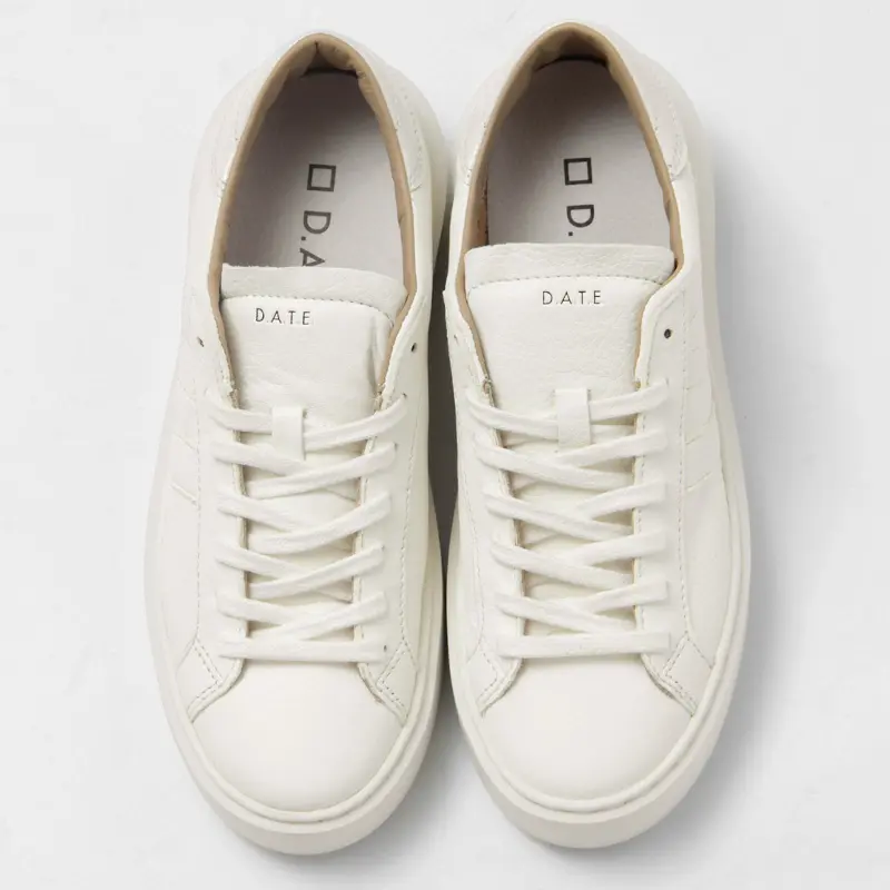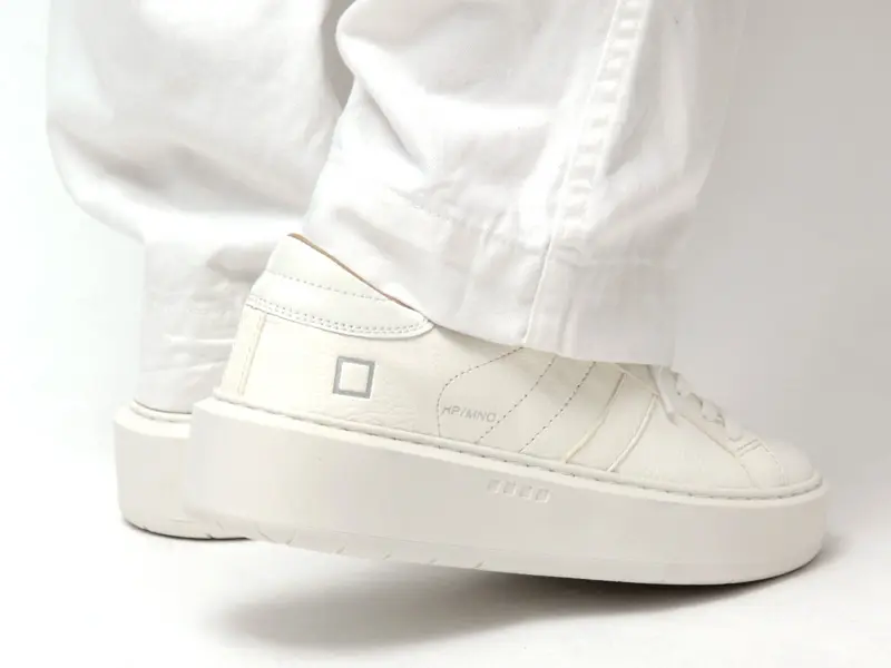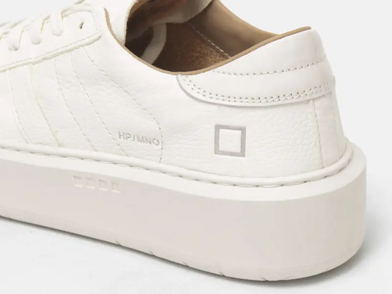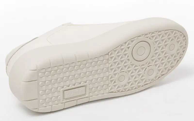 アッパーは、柔らかなシボ感のあるハンマーレザーを使用。シュータンには、ボディと同色のミルクホワイトにD.A.T.E.のエンボス加工レタリングを施し、洗練された統一感を演出しています。ヒールには、パテントレザーのバックパッチをあしらい、クリーンなワントーンの中にさりげないアクセントを加えています。