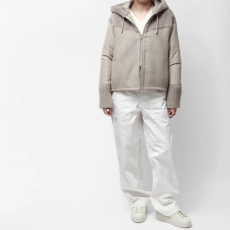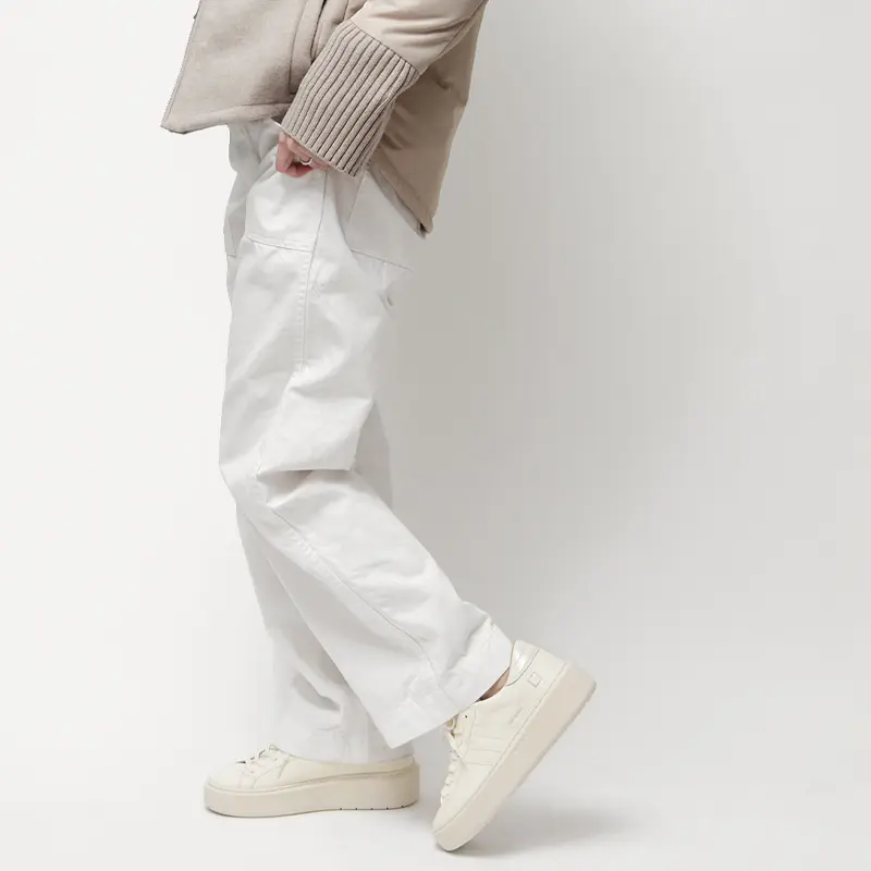 落ち着いたミルキーホワイトのワントーンカラーは、どんなコーディネートにも自然に馴染みます。デニムやチノパンなどのカジュアルなスタイルはもちろん、きれいめなスラックスやスカートにも相性抜群。足元にボリューム感を持たせることで、洗練された都会的な印象に仕上がります。