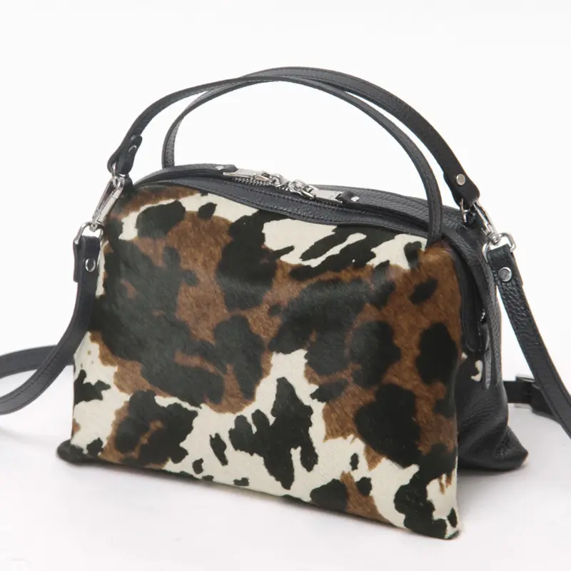 ハラコ調の毛皮にプリントを施した、個性豊かなバッグ。一つひとつ異なる柄の出方が、唯一無二の個性を演出します。柔らかな毛並みが高級感を醸し出し、持つ人のスタイルに洗練されたアクセントを加えます。普段の装いに、ワンランク上の華やかさと個性を添えるアイテムです。