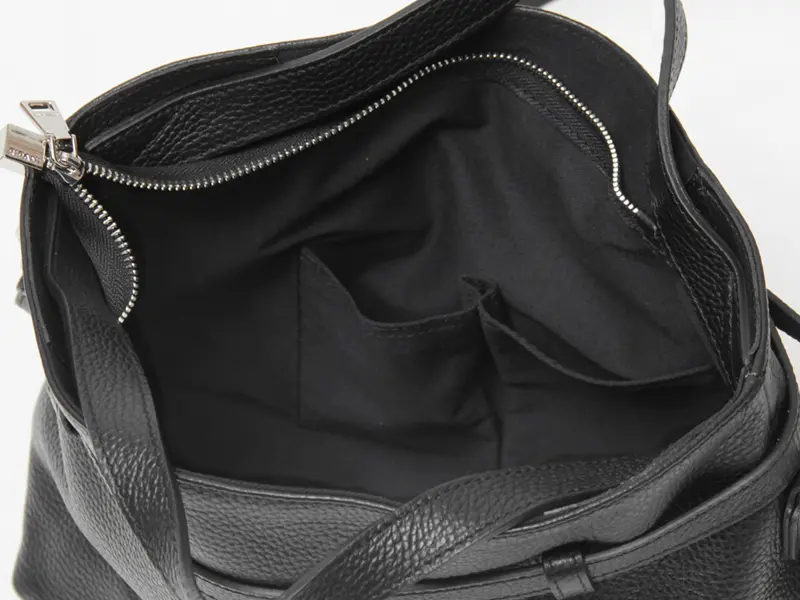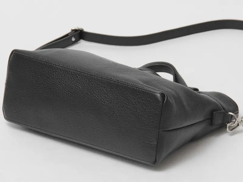 開閉はファスナー仕様で、上蓋がついているため、中身が見えず防犯面も安心です。充分なマチがあるので、長財布やポーチ、B5サイズのノート、ペットボトル、折り畳み傘なども余裕を持って収納可能。日々の必需品がすっきりと収まるため、普段使いからお仕事まで、幅広いシーンで活躍します。