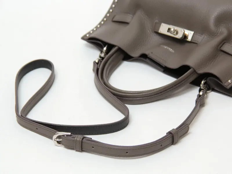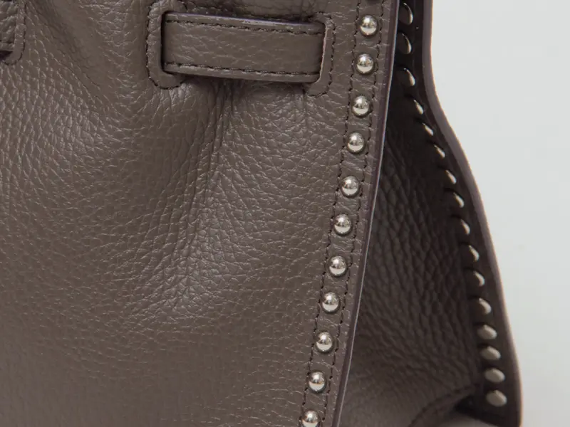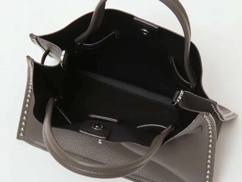 小ぶりのシルバースタッズを両サイドにあしらったベルト付きトートバッグ。スタッズは職人の手で一つひとつ丁寧に打ち込まれ、重厚感と高級感を演出。素材はシボ型押しのイタリアンレザーで、傷が付きにくく、しなやかで柔らかな手触りです。裏地を施さず内側に色をのせることで、軽やかな印象に仕上げました。細かなシボの上品な輝きが、コーディネートにさりげないアクセントを添える一品です。