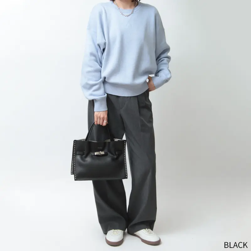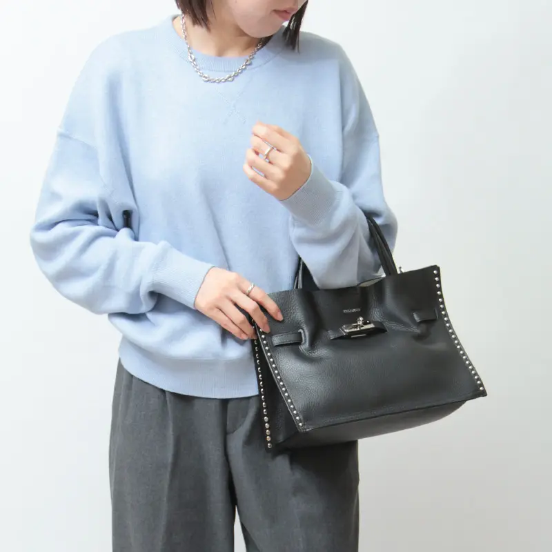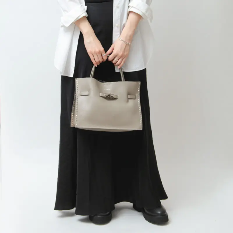 シルバーアクセサリーと呼応するようにきらめくスタッズが、コーデ全体をすっきりと引き締めてくれるデザイン。シルバーの金具をあしらったことで、手元や腕元のアクセサリーと一体感が生まれ、持つだけでスタイルに統一感とクールなムードを添えてくれます。シンプルな着こなしにも自然となじみつつ、ほどよい存在感で大人の装いをアップデートしてくれるトートバッグです。