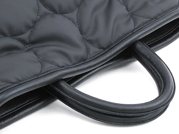 微撥水ラバー加工を施した、汚れや水を弾くポリウレタン生地を使用。日本の職人によって一つひとつ丁寧に作られています。マットな質感と大きめのドットステッチが、キルティングの柔らかな風合いを引き立てます。