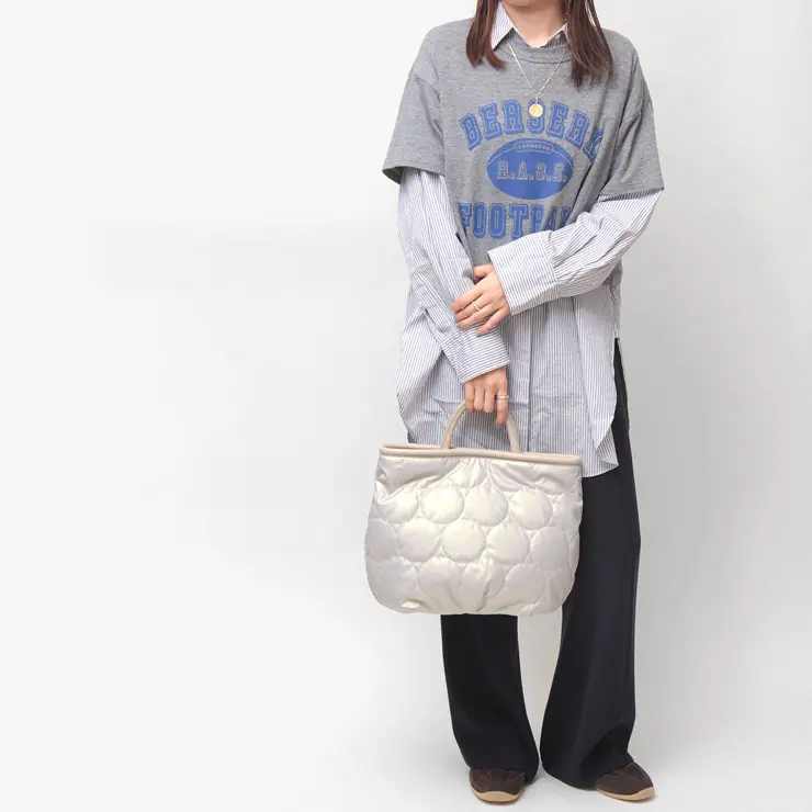 ふっくらと軽やかなドットキルティングバッグ。カジュアルなナイロン素材ながら、マットな落ち着いた質感が大人っぽさを演出します。Tシャツやデニムといったスタイルには、こなれたカジュアル感をプラス。きれいめなスタイルには、上品なアクセントとしてマッチします。撥水性にも優れているため、天候を気にせず毎日気軽に使えるのが嬉しいポイントです。