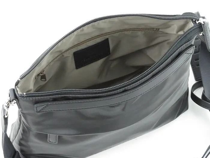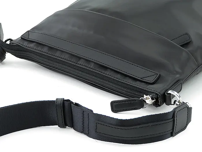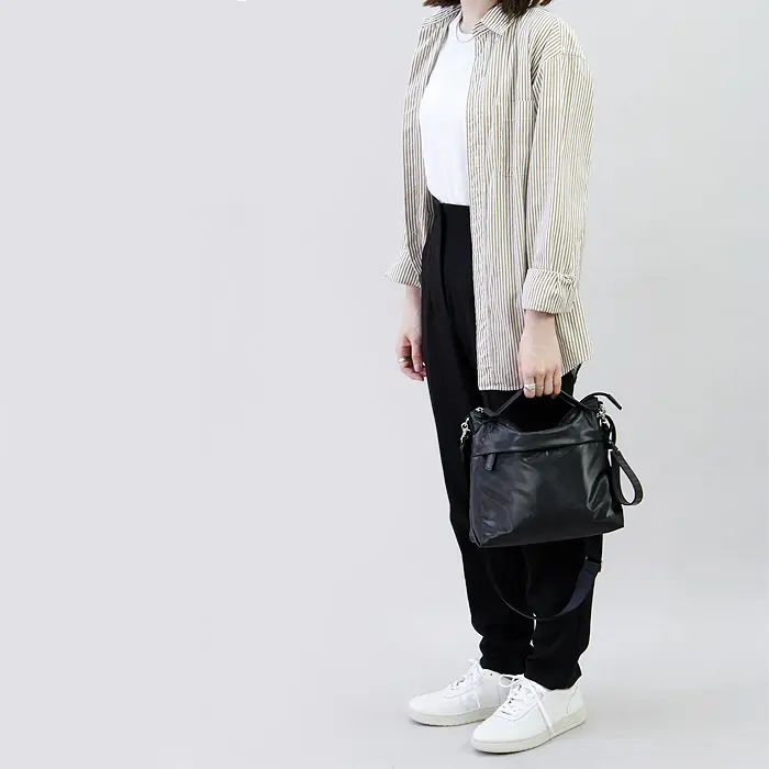 本体素材は、表面のポリウレタン部分とボリュームがありながらソフトな基布の2層から形成されており、強度に優れています。表面に繊細な絹目調のシボ加工を施しているのでセミマットで上品な光沢感があり軽量素材でも上品な印象です。水に強いので突然の雨も安心。丈夫なので扱いやすく、デイリーだけでなく、旅行やレジャーなどにも最適です。