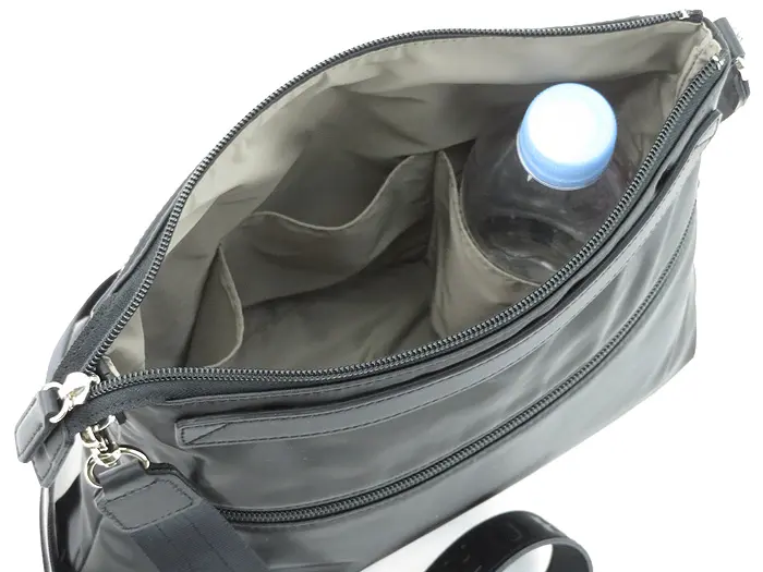 メイン収納の開閉は防犯面も安心のファスナー仕様。薄マチですが素材が柔らかいので意外と荷物が収まります。内ポケットとボトルホルダーがあり、ペットボトルや折り畳み傘などを立てて収納できるので、バッグの中身が整理でき、荷物もすぐに取り出せます。