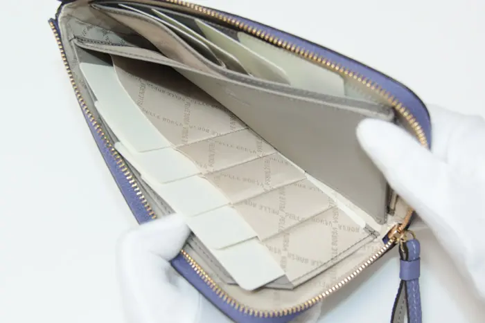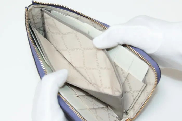 正面側と背面側にお札収納があります。片側オープンタイプでお札やレシート、領収書などもスムーズに出し入れができます。 裏地は抗菌防臭加工を施したペレボルサオリジナルジャガード。(黄色ブドウ球菌、肺炎かん菌、抗菌活性値など公的な検査機関において良好な検査結果を得ています。)