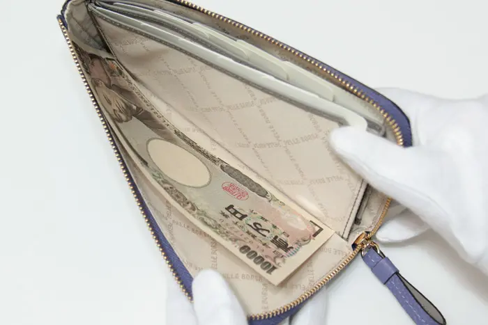正面側と背面側にお札収納があります。片側オープンタイプでお札やレシート、領収書などもスムーズに出し入れができます。 裏地は抗菌防臭加工を施したペレボルサオリジナルジャガード。(黄色ブドウ球菌、肺炎かん菌、抗菌活性値など公的な検査機関において良好な検査結果を得ています。)