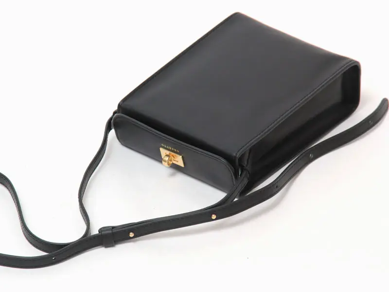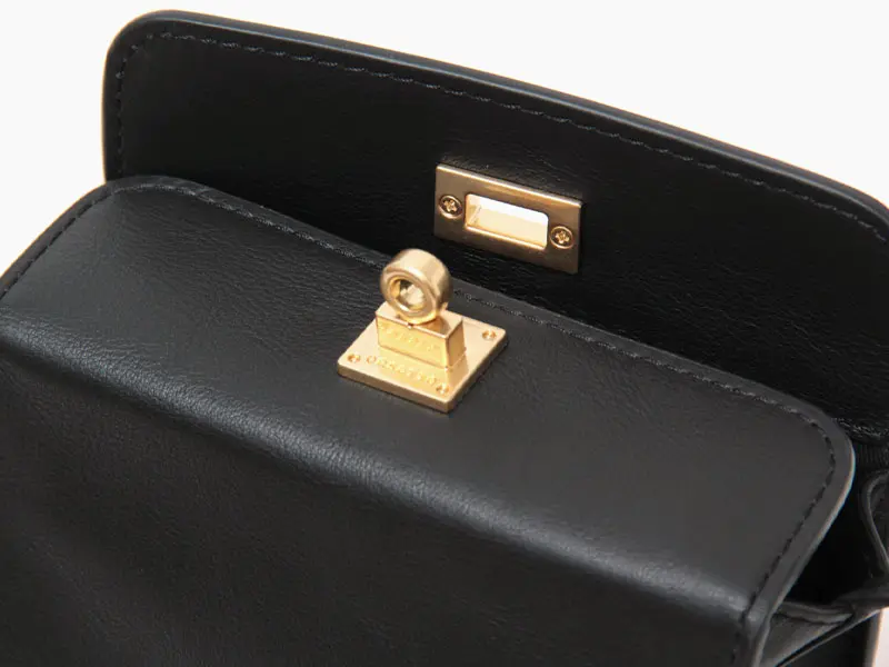 開閉はミニマルなフォルムに映える、洗練されたスクエア型のターンロック金具。デザインのアクセントであると同時に、ワンタッチでスムーズに開閉できる機能性も兼ね備えています。中央に刻印されたブランドロゴが、さりげない上質感をプラス。この艶やかな輝きが、バッグ全体のクラス感を高めます。