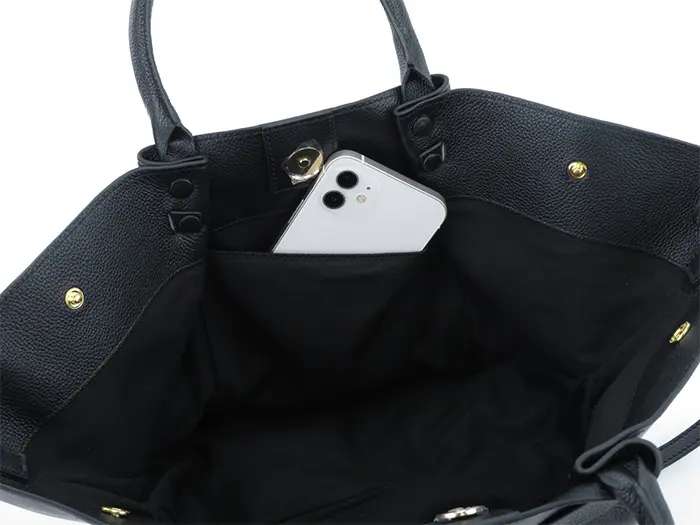 正面内側にオープンポケット1つ、背面内側にファスナーポケットが1つ備わっているので、鍵やスマホ、リップなどの小物の収納に便利です。