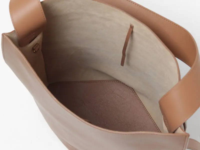 開口部は、上品なレザーコード仕様(紐で結ぶタイプ)を採用しています。バッグの内側は、カーフスキンをスエードフィニッシュで丁寧に仕上げており、中の荷物を優しく保護するとともに、開けた時にも高級感が漂います。