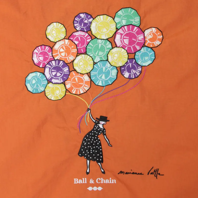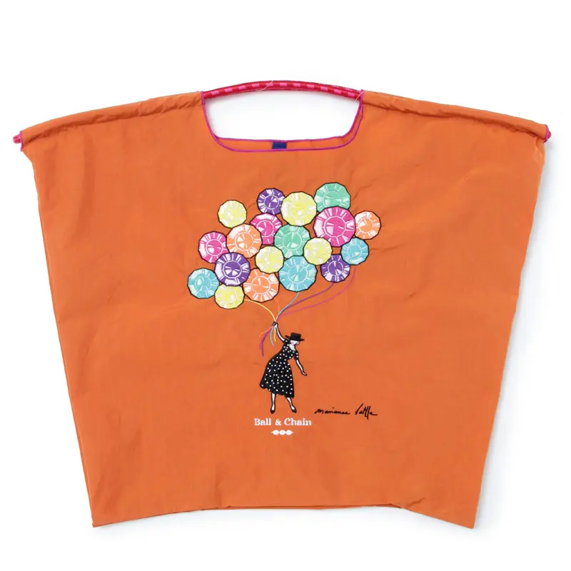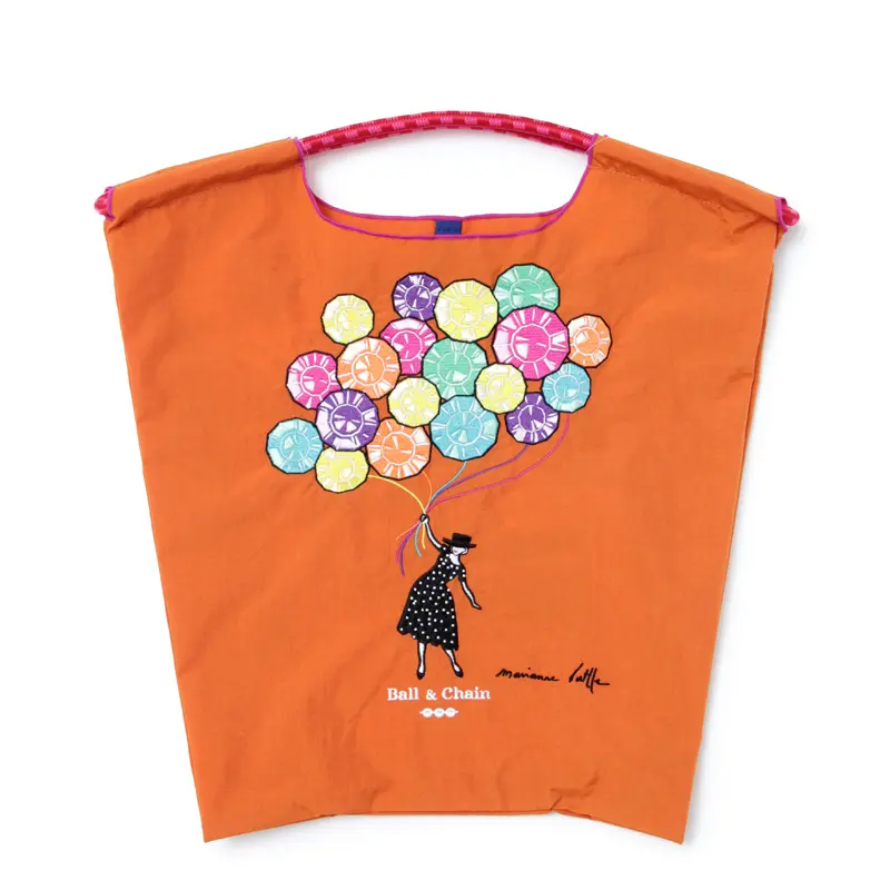 鮮やかなオレンジのナイロンバッグに馴染む、色とりどりの風船を持って空に浮かぶ女性のシルエットが刺繍された、可愛らしいデザイン。大人の女性にぴったりな、上品で華やかな気分を感じさせるエコバッグです。