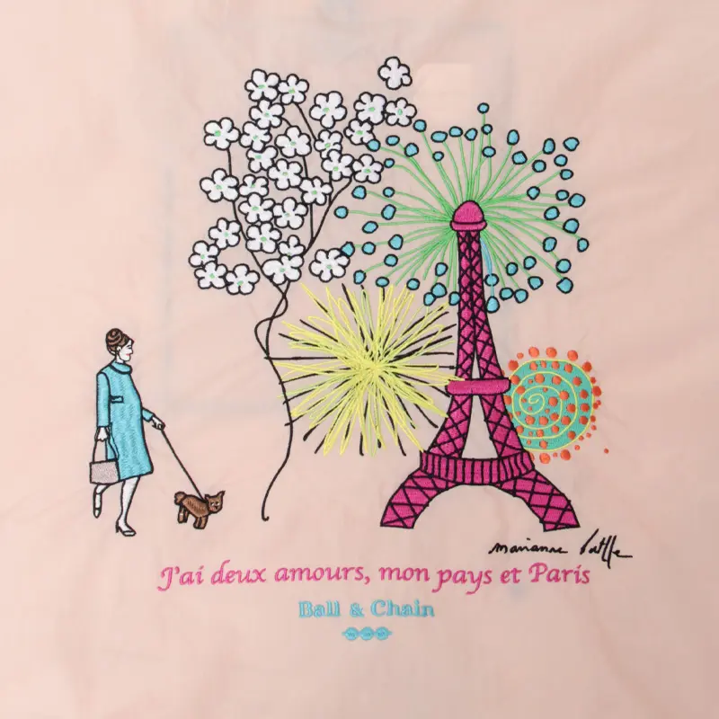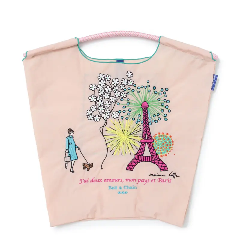 淡いピンクベージュのナイロンバッグに鮮やかな刺繍が際立ち、まるでパリの春のように華やかでロマンチックな世界観を感じさせるデザインです。大人の女性にぴったりな上品な雰囲気のエコバッグです。