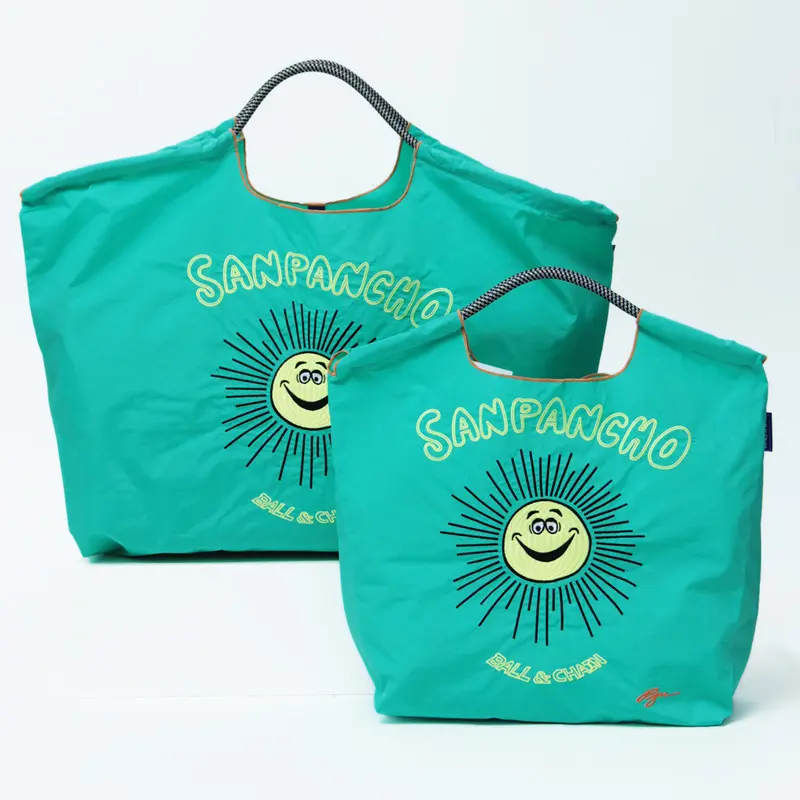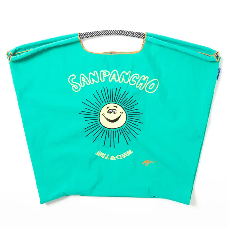ブルーグリーンのナイロンバッグは、ひと味違う配色が魅力で、空間を明るく彩ってくれます。クリエイターのRyuさんがメキシコで出会った街「San Pancho」からインスピレーションを受け、太陽を意味する「SUN」を掛け合わせて誕生したキャラクターが特徴のエコバッグです。