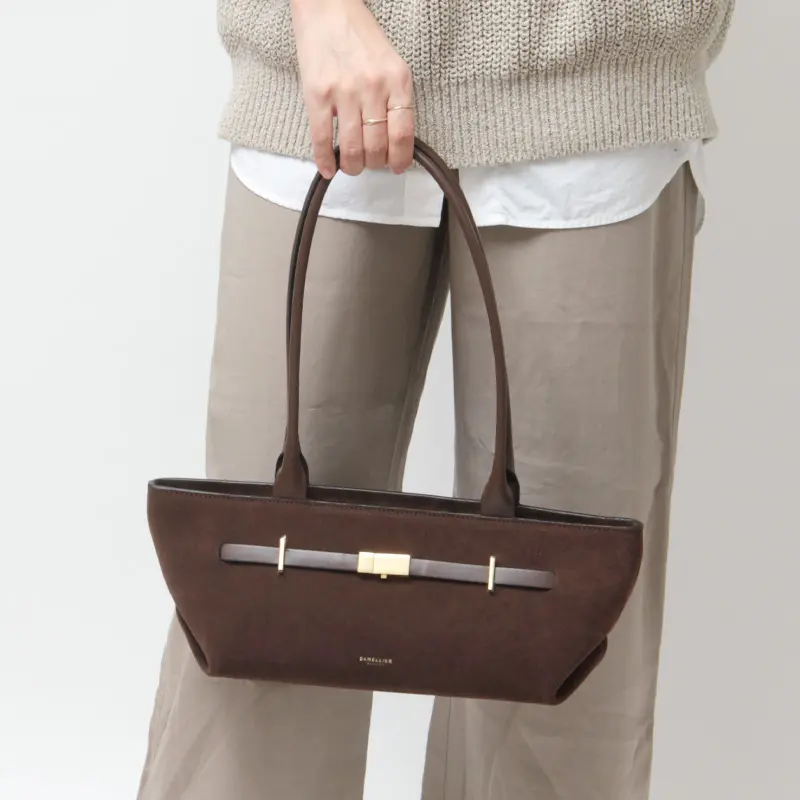ロンドン発の人気ブランド「DEMELLIER(デメリエー)」より、「The NEW YORK SHOULDER」シリーズのトートバッグが登場。トレンド感漂うブラウンカラーとスエード素材が、装いに上品な深みを与えます。長めのハンドルと横長のシルエットが特徴で、肩掛けしやすくスマートな印象に。必需品がきちんと収まるコンパクトなサイズ感は、デイリーからオケージョンまで幅広く活躍。セレブリティにも注目されるエレガントな佇まいが、日常を特別にしてくれる一品です。