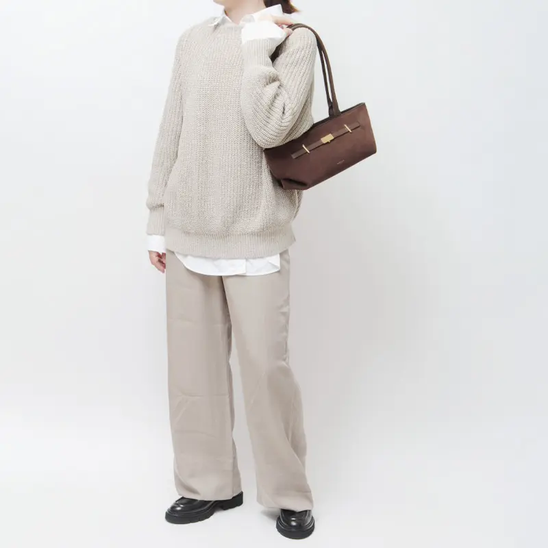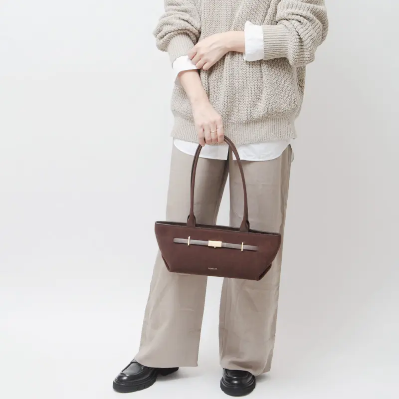 長めのハンドルは肩掛けでも手持ちでも美しく収まり、腕や肩への負担も軽減。持つだけでスタイルに洗練された印象を添え、日常のコーディネートを自然に格上げしてくれます。