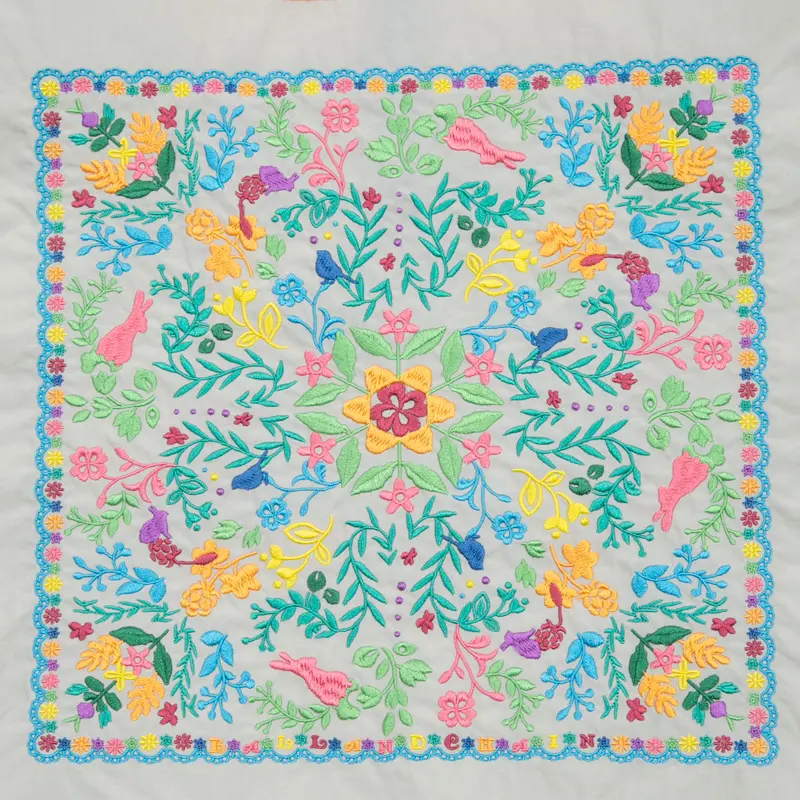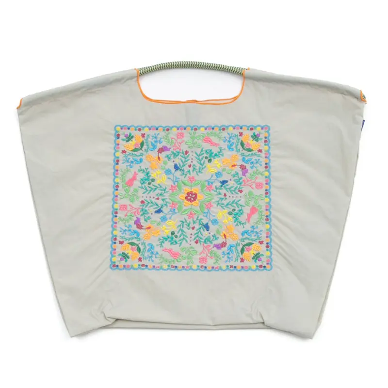 ペールグレーのナイロンバッグにカラフルな花を散りばめ、バランスよく調和したデザイン。見ているだけで明るい気持ちになる可愛さに、よく見るとうさぎが隠れた遊び心も楽しめるエコバッグに仕上がっています。
