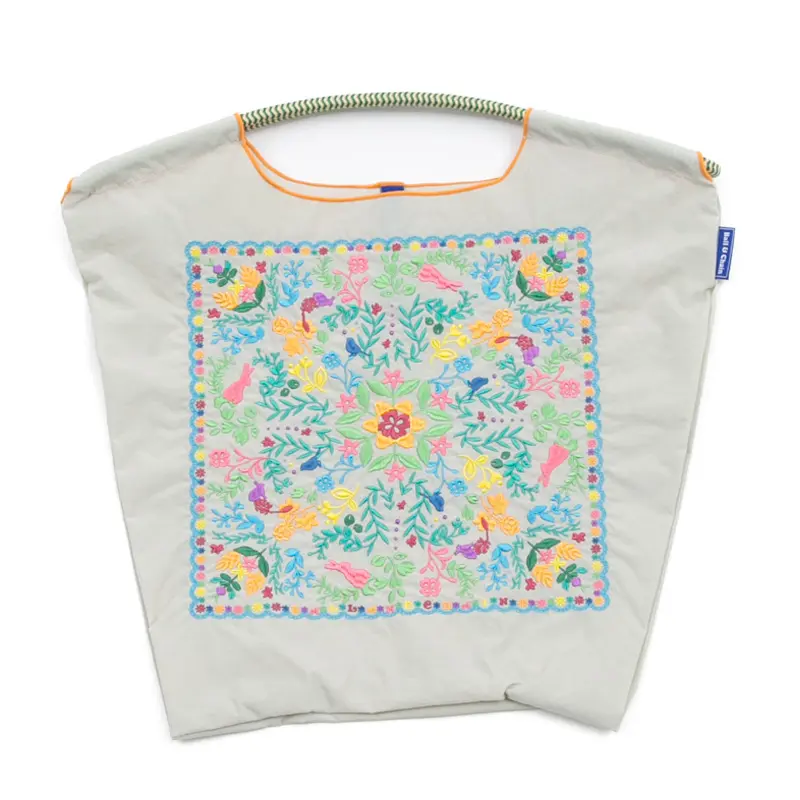 グラフィックデザインをそのまま刺繍で施すことで高級感がありデザイン性の高い仕上がりに。見た目だけでなく耐久性、撥水性に優れた厚手の素材を使用しているので、重い荷物の持ち運びも安心です。折りたたむと、手のひらほどのサイズになるのでコンパクトにしまえ、買い物への活用はもちろん、常に携帯しておけば外出中に急に荷物が増えた時などに対応でき、非常に便利なエコバッグです。エコなプレゼントとしても人気のアイテムです。