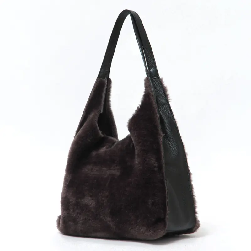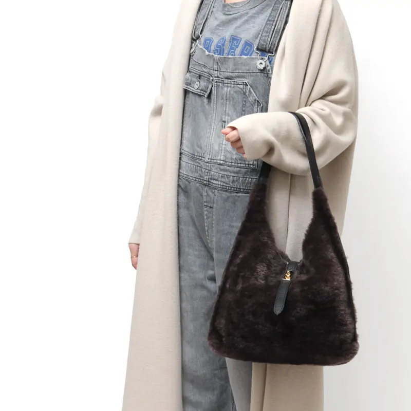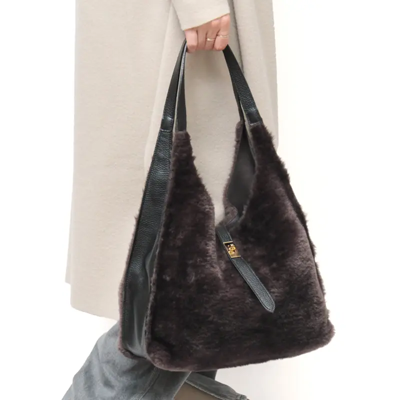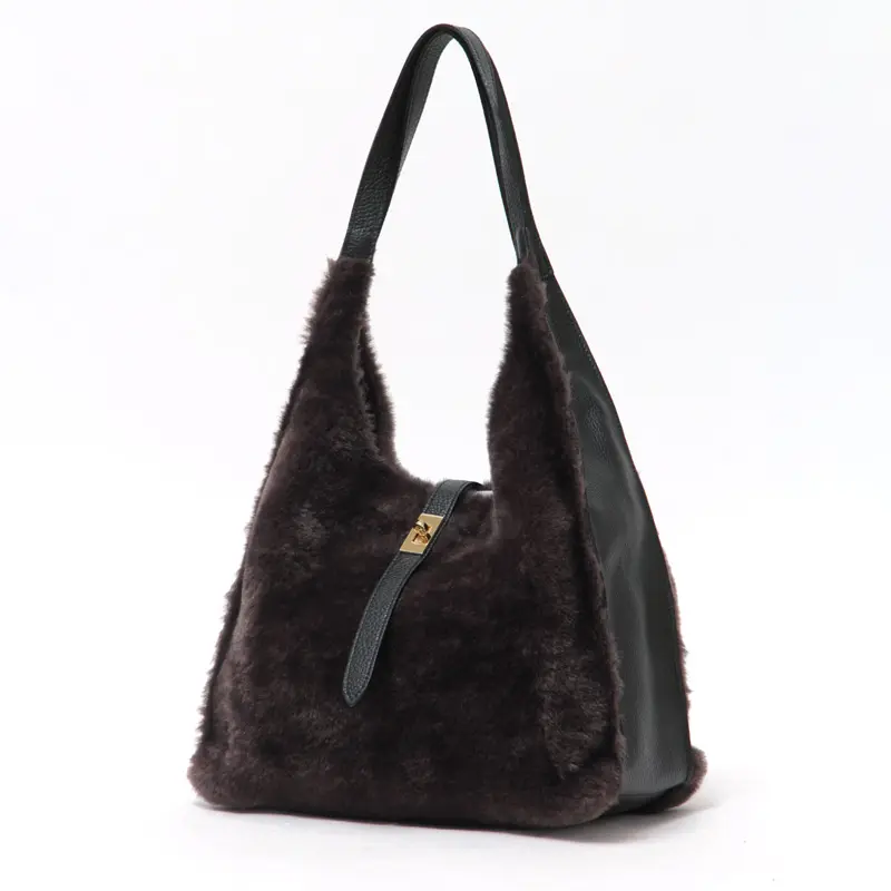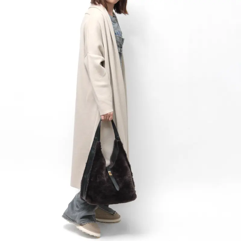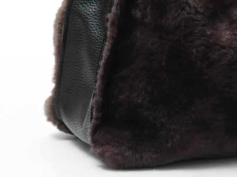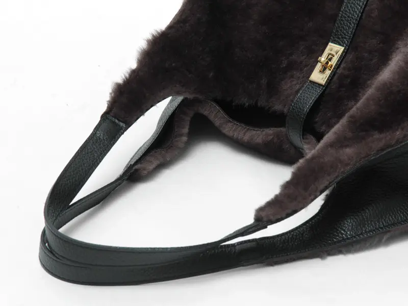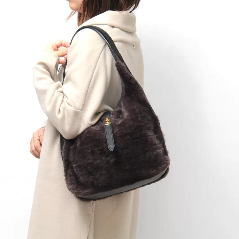 表地はふんわりとしたエコムートン、内側はレザーを貼っており異素材のWフェイス仕様で、異なる質感を楽しめます。温かみのある素材がシーズンムードを盛り上げ、きれいめにもカジュアルにも合わせやすいです。端を切りっぱなしにすることで、こなれた雰囲気を演出。異素材のコントラストが上品で、大人の女性にぴったりのバッグに仕上がっています。