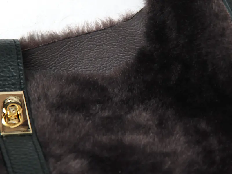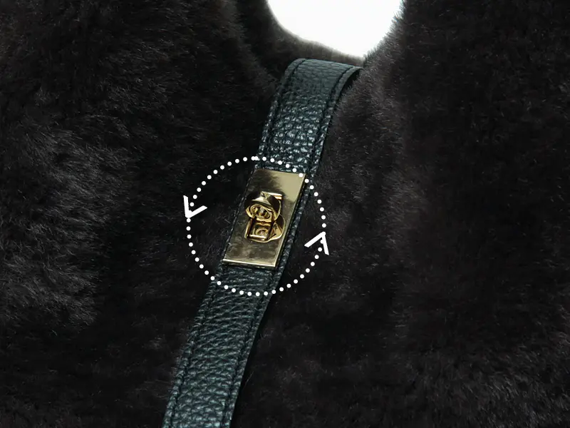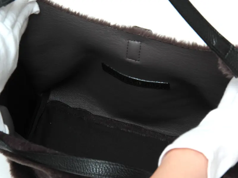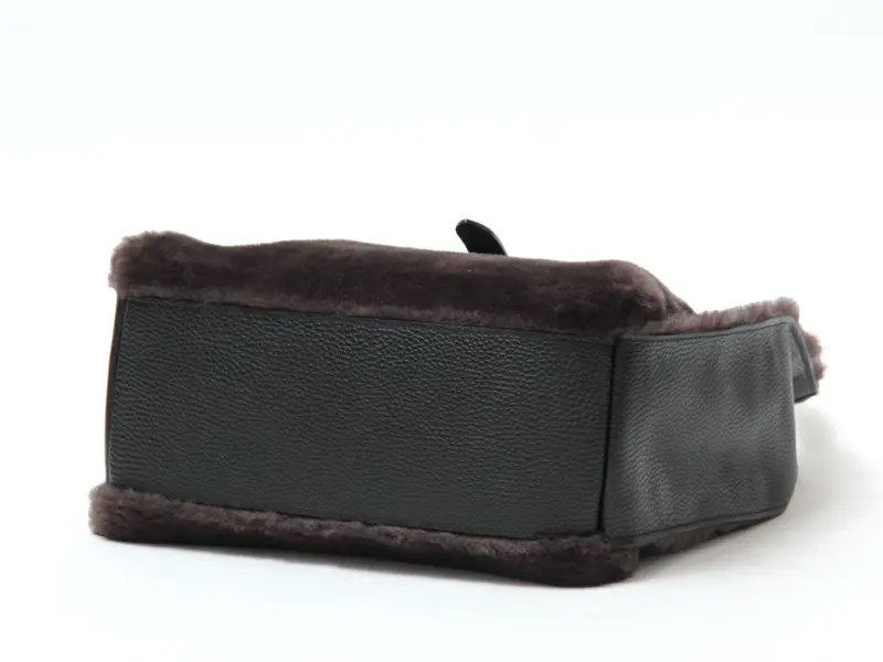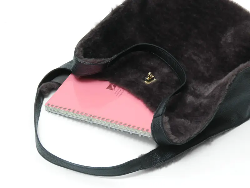B5サイズのノートやファイルが横向きできれいに入るサイズ感で、マチ幅が広く、マチ幅が広く、長財布やポーチなどの必需品だけでなく、500mlのペットボトルや折りたたみ傘なども収納可能で、見た目以上の収納力です。ファー部分の内側はレザーを貼っているので高級感のある仕上がりです。