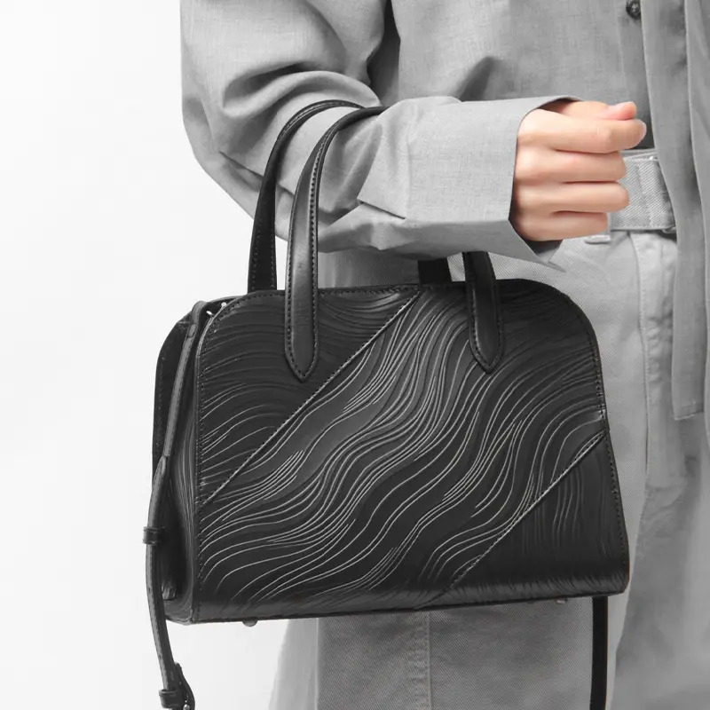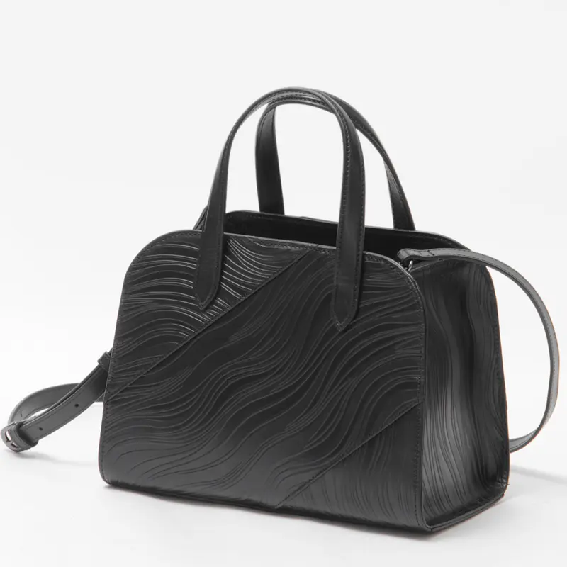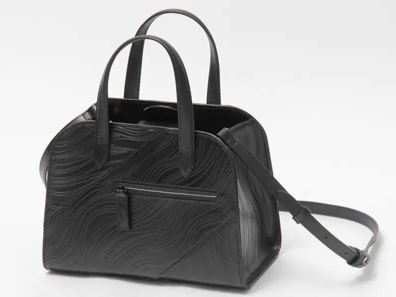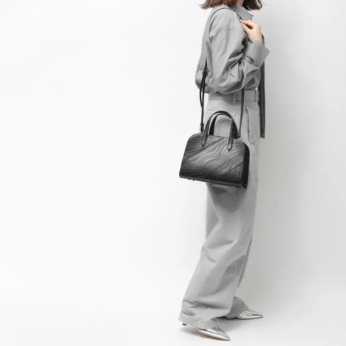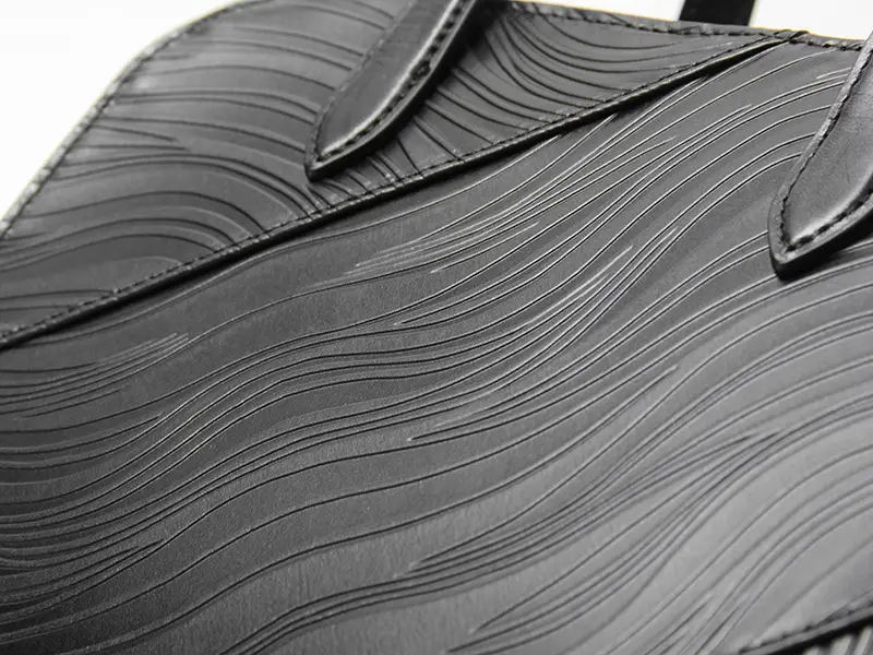 「ノワリズム」の最大の特徴は、上質なブラックレザーに施された波型エンボス加工です。繊細な曲線が織りなすこの模様は、光や角度で表情を変え、まるでアート作品のような奥行きを醸し出します。程よい光沢感がモダンで高級感を確立。型押しによる傷の目立ちにくさという実用性も兼ね備えた、長く愛用できる個性的な素材です。