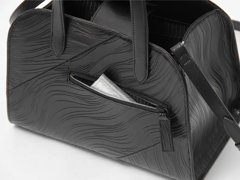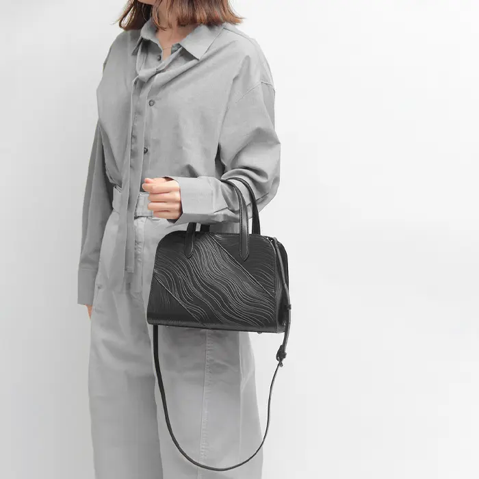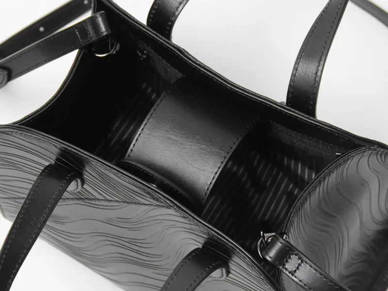 本体全面に深くと施された流れるような波状のエンボス加工が、光の加減で豊かな陰影を生み出し、持つ人に唯一無二の個性を添える2wayトートバッグ。 バッグの表面を斜めに走るシャープな切り替えラインが、デザイン全体をモダンに引き締め、洗練された印象を与えます。 流行に左右されないタイムレスなデザインは、ビジネスシーンはもちろん、カジュアル、フォーマルな装いまで、幅広いシーンであなたのスタイルを格上げします。