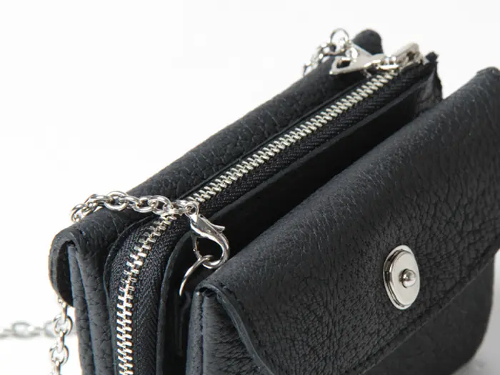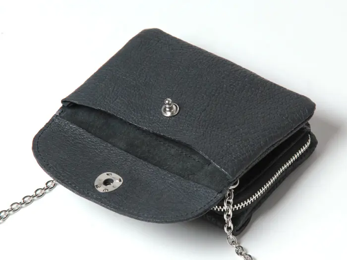 ミリタリーのポーチをモチーフにした"POMTATA ポンタタ"のお財布ポシェット。L字ファスナーのミニ財布にシルバーチェーンをドッキングさせた、ポケット感覚で必需品を持ち歩くのにとても便利なアイテム。アクティブなお出かけや旅行先など、貴重品を肌身離さず持てるポーチウォレットです。
