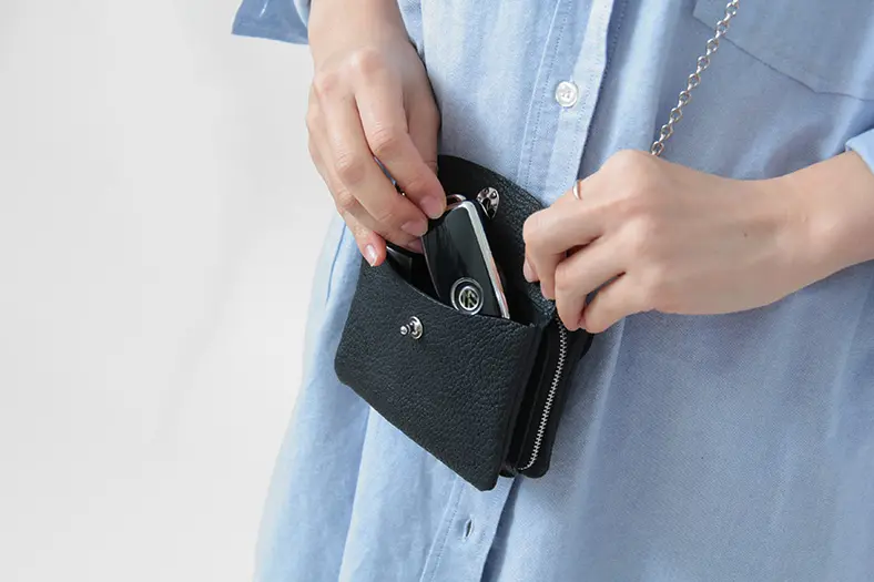 お財布とバッグの機能を両方兼ね備えた便利なアイテム。肩掛けや斜め掛けでお使いいただけます。また、簡単に取り外せるのでノーマルなミニウォレットとしてもご使用いただけます。